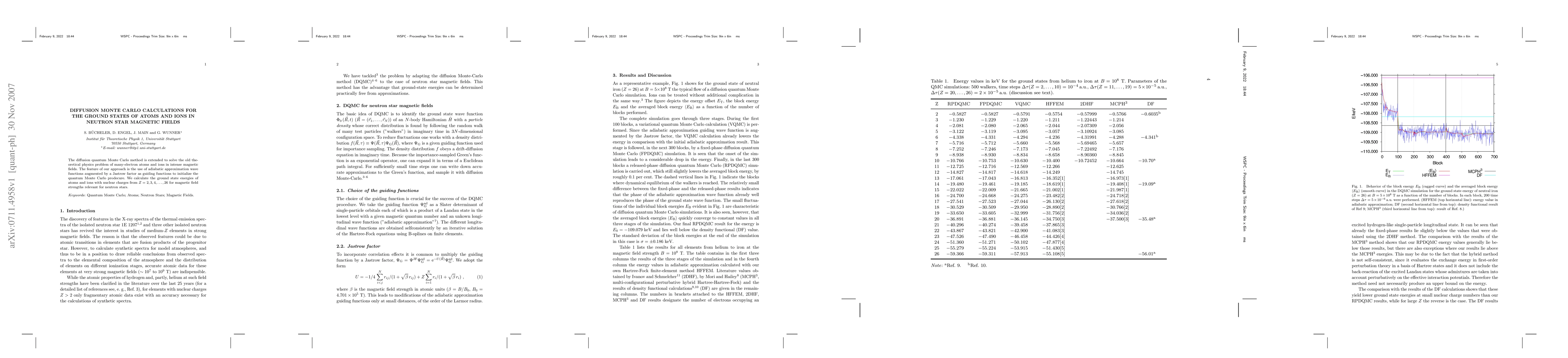 The diffusion quantum Monte Carlo method is extended to solve the old theoretical physics problem of many-electron atoms and ions in intense magnetic fields. The feature of our approach is the use of adiabatic approximation wave functions augmented by a Jastrow factor as guiding functions to initialize the quantum Monte Carlo prodecure. We calcula te the ground state energies of atoms and ions with nuclear charges from Z= 2, 3, 4, ..., 26 for magnetic field strengths relevant for neutron stars.