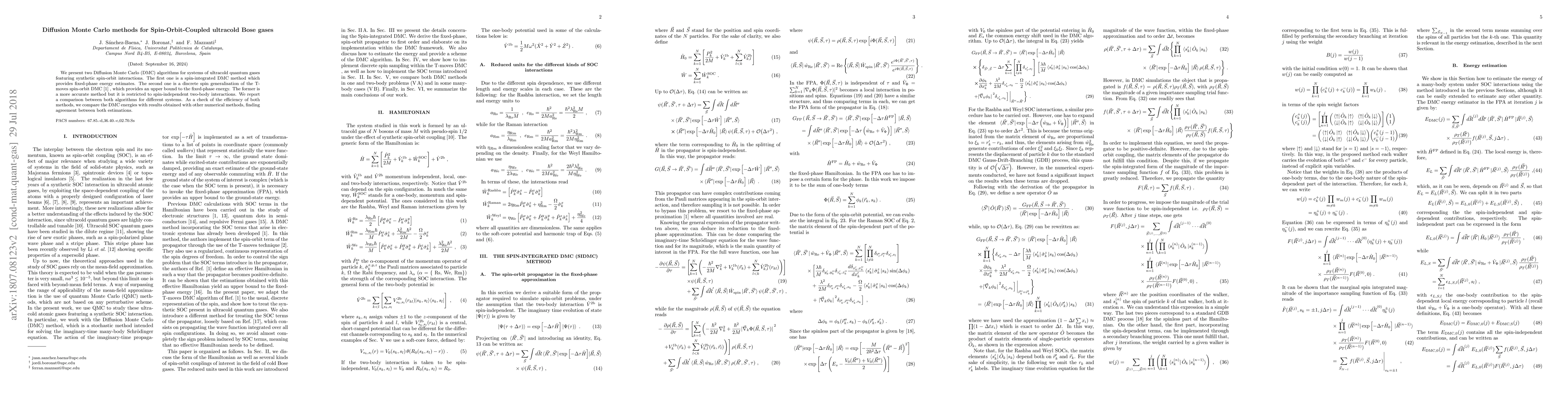 We present two Diffusion Monte Carlo (DMC) algorithms for systems of ultracold quantum gases featuring synthetic spin-orbit interactions. The first one is a discrete spin generalization of the T- moves spin-orbit DMC, which provides an upper bound to the fixed-phase energy. The second is a spin-integrated DMC method which recovers the fixed-phase property by avoiding the definition of the effective Hamiltonian involved in the T-moves approach. The latter is a more accurate method but it is restricted to spin-independent two-body interactions. We report a comparison between both algorithms for different systems. As a check of the efficiency of both methods, we compare the DMC energies with results obtained with other numerical methods, finding agreement between both estimation