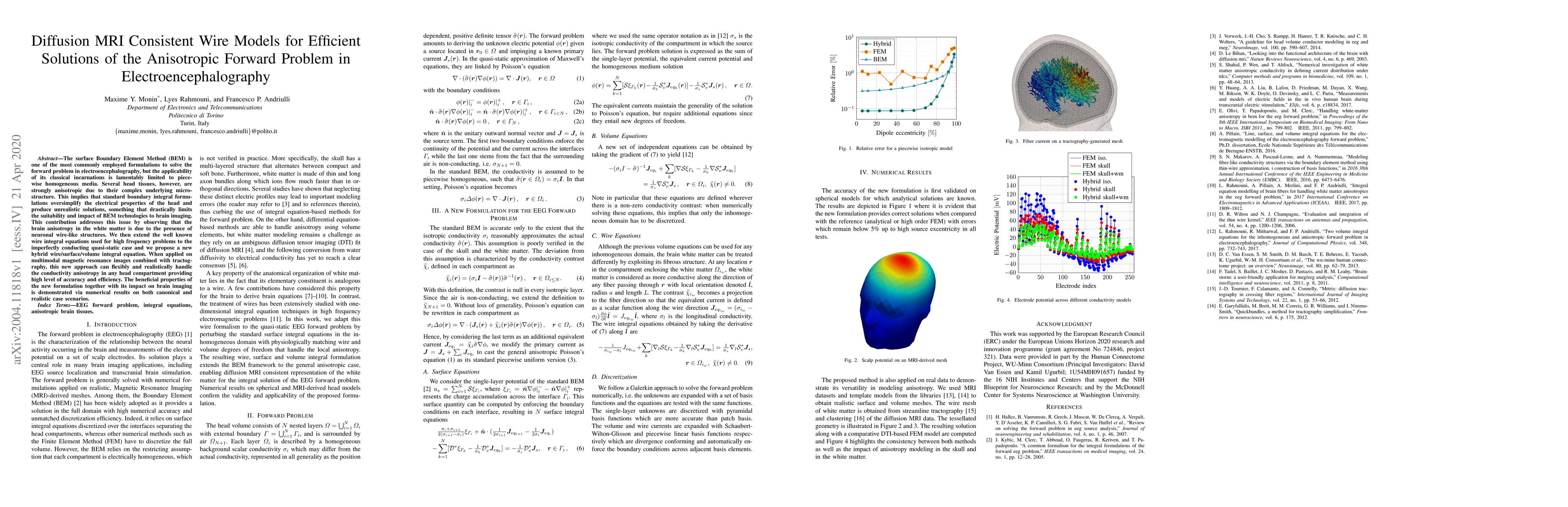 This paper proposes a new hybrid wire/surface/volume integral equation to solve the anisotropic forward problem in electroencephalography, addressing limitations of traditional Boundary Element Methods. The approach leverages diffusion MRI and tractography to better model the anisotropic properties of brain tissues, demonstrating improved accuracy and efficiency in brain imaging.