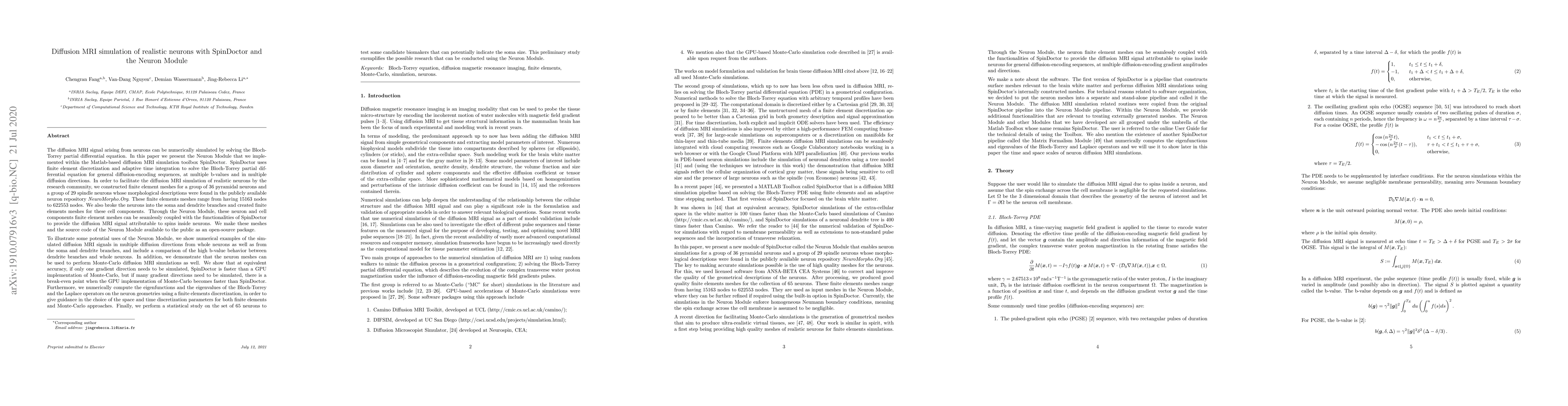 The paper presents the Neuron Module implemented in the SpinDoctor MATLAB-based diffusion MRI simulation toolbox. It utilizes finite element discretization and adaptive time integration to solve the Bloch-Torrey PDE for various diffusion-encoding sequences, at multiple b-values and directions. Finite element meshes were constructed for 36 pyramidal and 29 spindle neurons from the NeuroMorpho.org repository, enabling seamless coupling with SpinDoctor functionalities.