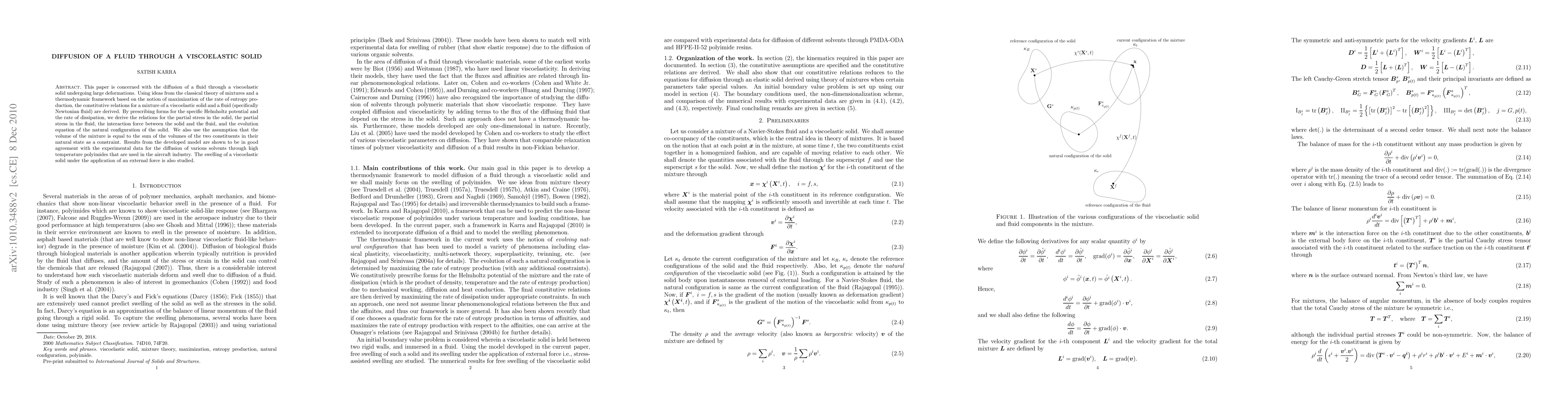 This paper is concerned with the diffusion of a fluid through a viscoelastic solid undergoing large deformations. Using ideas from the classical theory of mixtures and a thermodynamic framework based on the notion of maximization of the rate of entropy production, the constitutive relations for a mixture of a viscoelastic solid and a fluid (specifically Newtonian fluid) are derived. By prescribing forms for the specific Helmholtz potential and the rate of dissipation, we derive the relations for the partial stress in the solid, the partial stress in the fluid, the interaction force between the solid and the fluid, and the evolution equation of the natural configuration of the solid. We also use the assumption that the volume of the mixture is equal to the sum of the volumes of the two constituents in their natural state as a constraint. Results from the developed model are shown to be in good agreement with the experimental data for the diffusion of various solvents through high temperature polyimides that are used in the aircraft industry. The swelling of a viscoelastic solid under the application of an external force is also studied.
