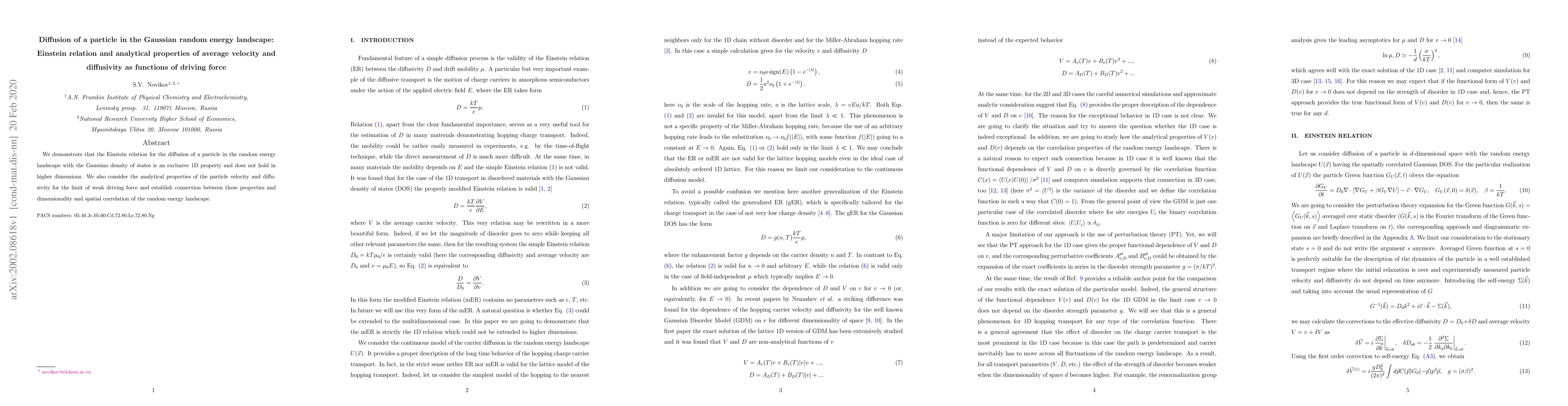 We demonstrate that the Einstein relation for the diffusion of a particle in the random energy landscape with the Gaussian density of states is an exclusive 1D property and does not hold in higher dimensions. We also consider the analytical properties of the particle velocity and diffusivity for the limit of weak driving force and establish connection between these properties and dimensionality and spatial correlation of the random energy landscape.