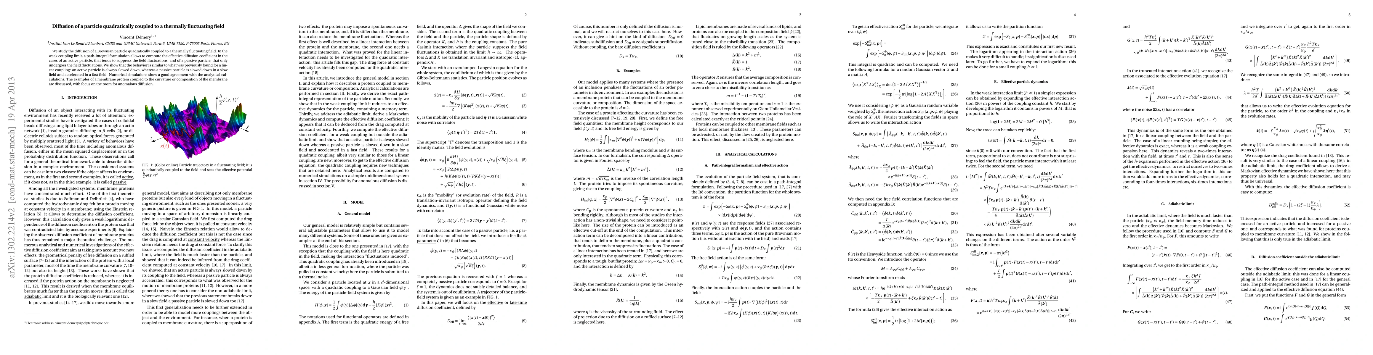 We study the diffusion of a Brownian particle quadratically coupled to a thermally fluctuating field. In the weak coupling limit, a path-integral formulation allows to compute the effective diffusion coefficient in the cases of an active particle, that tends to suppress the field fluctuations, and of a passive particle, that only undergoes the field fluctuations. We show that the behavior is similar to what was previously found for a linear coupling: an active particle is always slowed down, whereas a passive particle is slowed down in a slow field and accelerated in a fast field. Numerical simulations show a good agreement with the analytical calculations. The examples of a membrane protein coupled to the curvature or composition of the membrane are discussed, with focus on the room for anomalous diffusion.