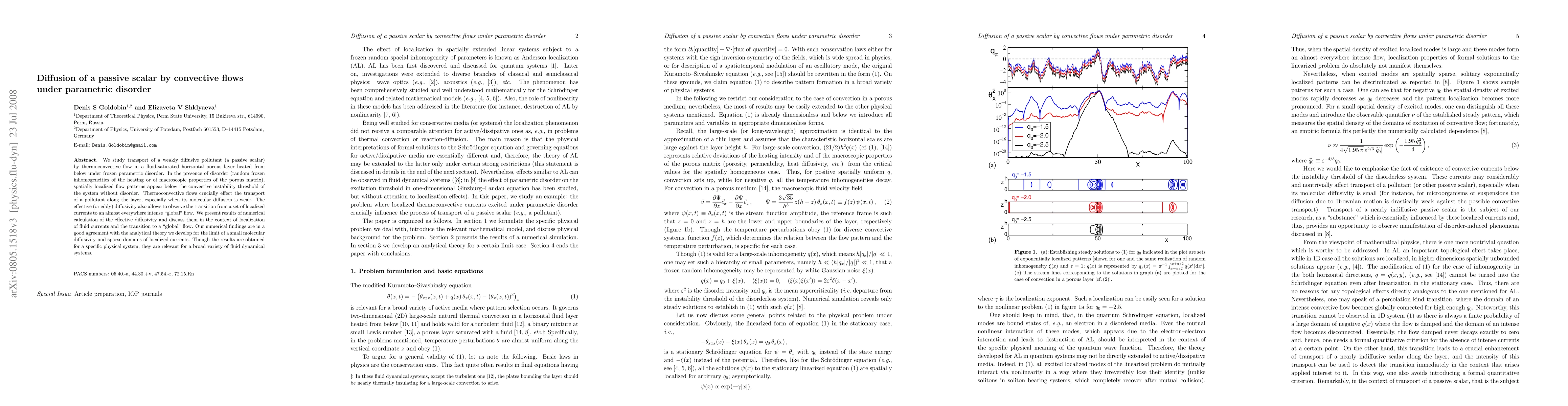 We study transport of a weakly diffusive pollutant (a passive scalar) by thermoconvective flow in a fluid-saturated horizontal porous layer heated from below under frozen parametric disorder. In the presence of disorder (random frozen inhomogeneities of the heating or of macroscopic properties of the porous matrix), spatially localized flow patterns appear below the convective instability threshold of the system without disorder. Thermoconvective flows crucially effect the transport of a pollutant along the layer, especially when its molecular diffusion is weak. The effective (or eddy) diffusivity also allows to observe the transition from a set of localized currents to an almost everywhere intense "global" flow. We present results of numerical calculation of the effective diffusivity and discuss them in the context of localization of fluid currents and the transition to a "global" flow. Our numerical findings are in a good agreement with the analytical theory we develop for the limit of a small molecular diffusivity and sparse domains of localized currents. Though the results are obtained for a specific physical system, they are relevant for a broad variety of fluid dynamical systems.