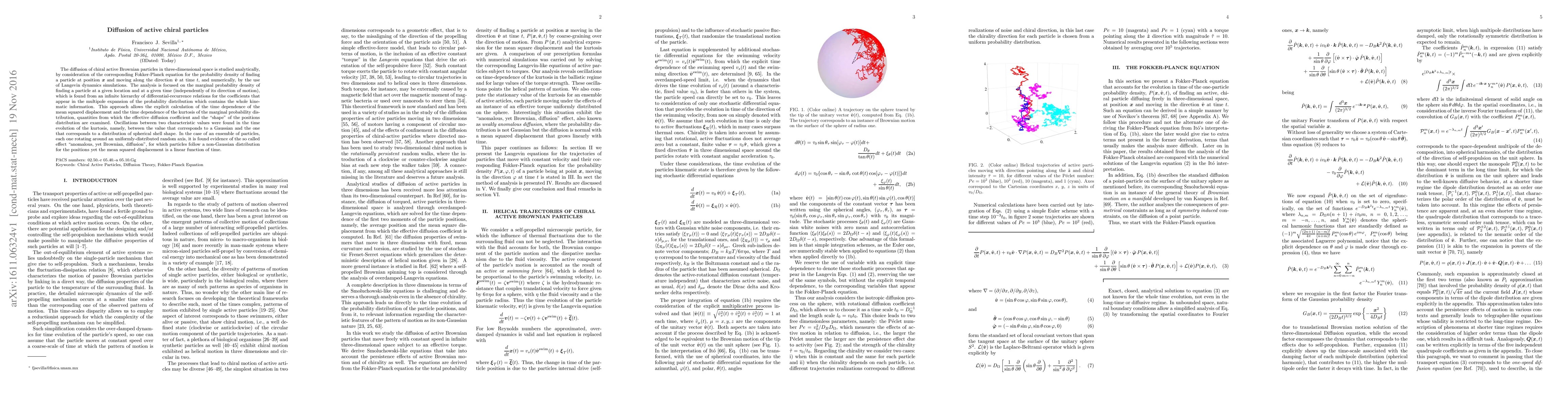 The study analytically and numerically investigates the diffusion of chiral active Brownian particles in 3D space using the Fokker-Planck equation and Langevin dynamics simulations, focusing on the marginal probability density of finding a particle at a given location and time.