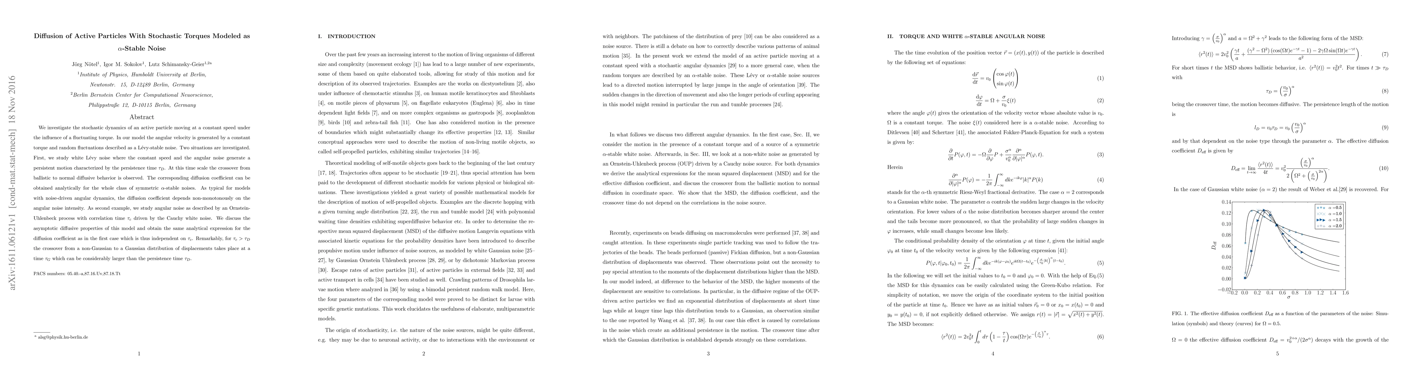 We investigate the stochastic dynamics of an active particle moving at a constant speed under the influence of a fluctuating torque. In our model the angular velocity is generated by a constant torque and random fluctuations described as a L\'evy-stable noise. Two situations are investigated. First, we study white L\'evy noise where the constant speed and the angular noise generate a persistent motion characterized by the persistence time $\tau_D$. At this time scale the crossover from ballistic to normal diffusive behavior is observed. The corresponding diffusion coefficient can be obtained analytically for the whole class of symmetric $\alpha$-stable noises. As typical for models with noise-driven angular dynamics, the diffusion coefficient depends non-monotonously on the angular noise intensity. As second example, we study angular noise as described by an Ornstein-Uhlenbeck process with correlation time $\tau_c$ driven by the Cauchy white noise. We discuss the asymptotic diffusive properties of this model and obtain the same analytical expression for the diffusion coefficient as in the first case which is thus independent on $\tau_c$. Remarkably, for $\tau_c>\tau_D$ the crossover from a non-Gaussian to a Gaussian distribution of displacements takes place at a time $\tau_G$ which can be considerably larger than the persistence time $\tau_D$.