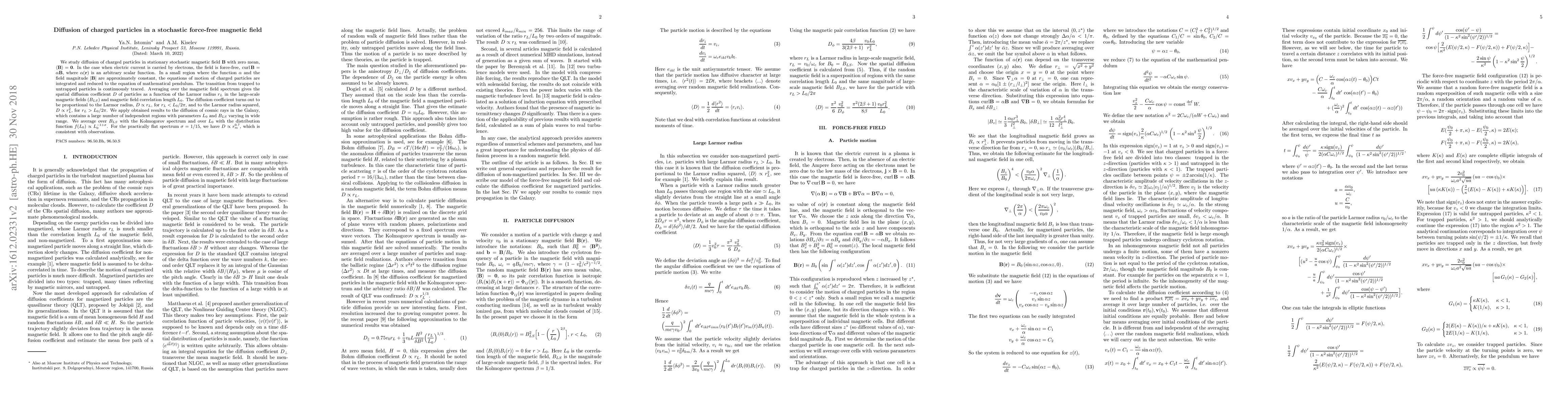 This paper investigates the diffusion of charged particles in a stochastic force-free magnetic field, deriving a spatial diffusion coefficient dependent on the Larmor radius and magnetic field correlation length. The results are applied to cosmic ray diffusion in the Galaxy, yielding a diffusion coefficient proportional to $r_L^{0.7}$, consistent with observational data.
