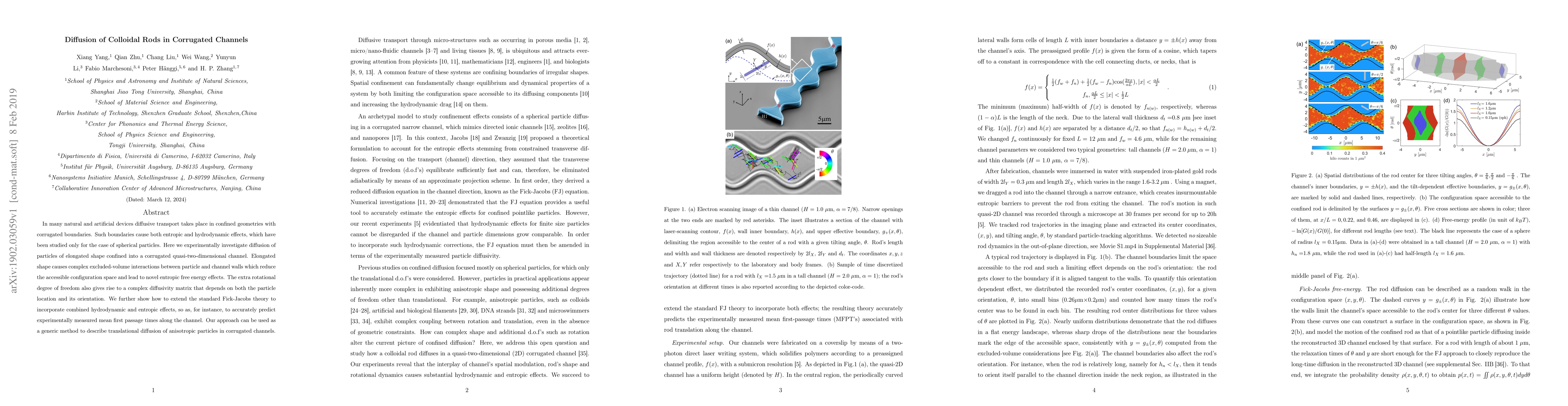 This paper experimentally investigates the diffusion of elongated colloidal rods in corrugated channels, revealing complex interactions and a novel entropic free energy due to shape anisotropy. The study extends Fick-Jacobs theory to predict mean first passage times, offering a method for describing anisotropic particle diffusion in confined geometries.
