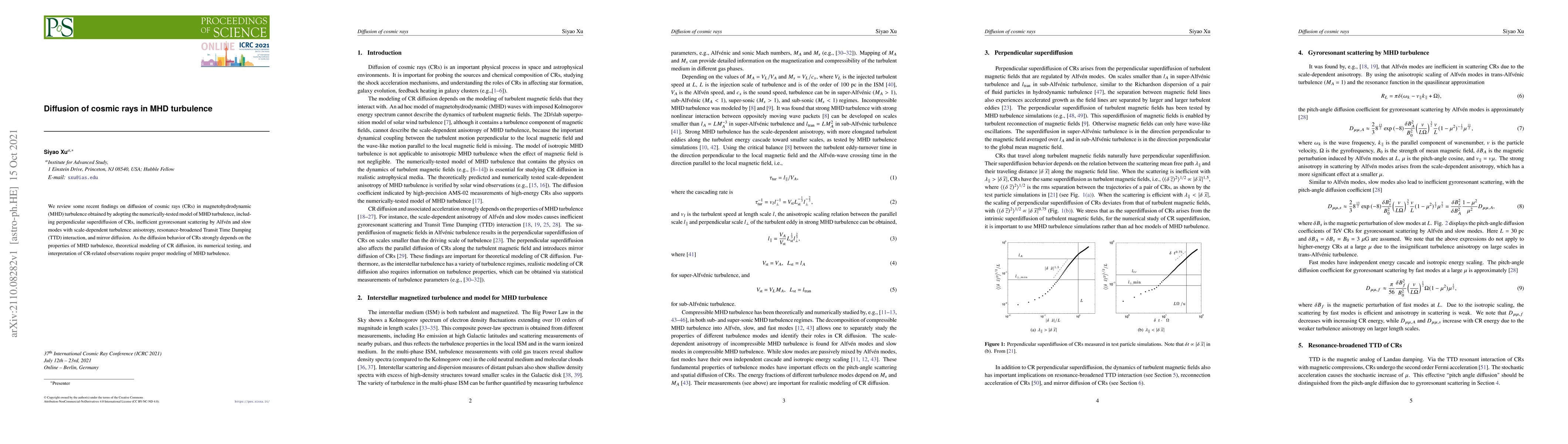 This paper reviews recent findings on cosmic ray diffusion in magnetohydrodynamic (MHD) turbulence, highlighting phenomena such as perpendicular superdiffusion, inefficient gyroresonant scattering, and scale-dependent turbulence anisotropy, emphasizing the need for accurate MHD turbulence modeling for theoretical and observational interpretations.