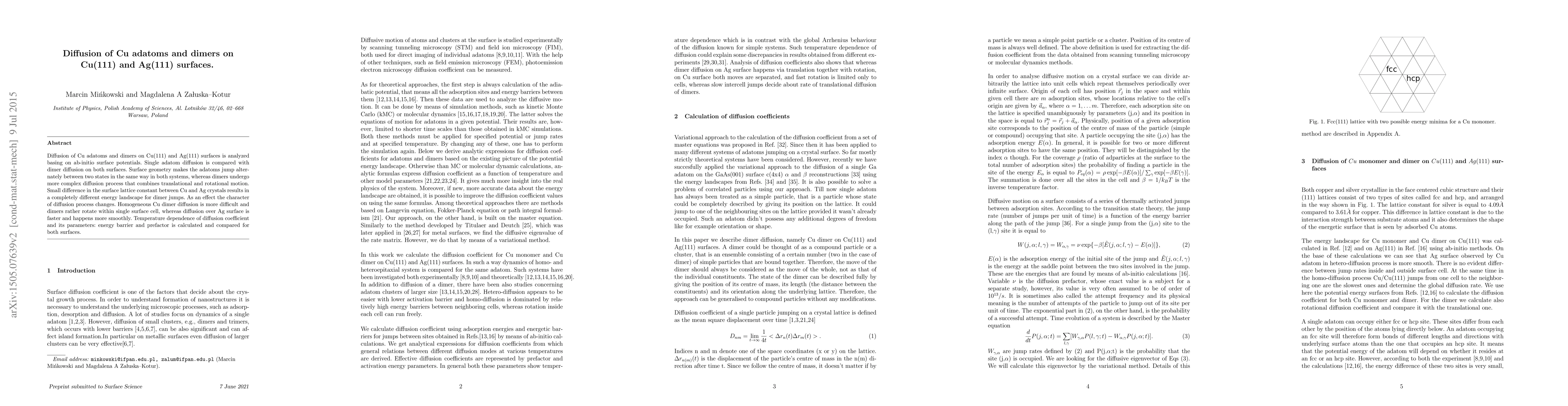 This research investigates the diffusion of Cu adatoms and dimers on Cu(111) and Ag(111) surfaces using ab-initio surface potentials, finding that while single adatoms diffuse via simple jumps, dimers exhibit more complex translational and rotational diffusion. The study calculates and compares diffusion coefficients, revealing temperature-dependent parameters for dimers due to varied energy barriers, and notes significant differences in diffusion processes between Cu and Ag surfaces caused by small lattice constant variations.