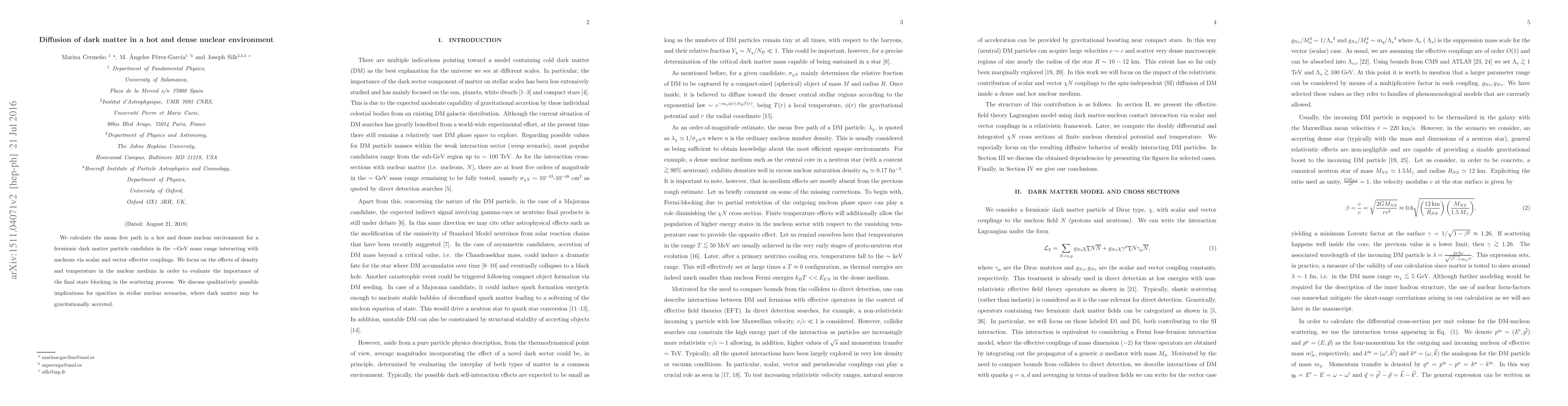 We calculate the mean free path in a hot and dense nuclear environment for a fermionic dark matter particle candidate in the $\sim$GeV mass range interacting with nucleons via scalar and vector effective couplings. We focus on the effects of density and temperature in the nuclear medium in order to evaluate the importance of the final state blocking in the scattering process. We discuss qualitatively possible implications for opacities in stellar nuclear scenarios, where dark matter may be gravitationally accreted.