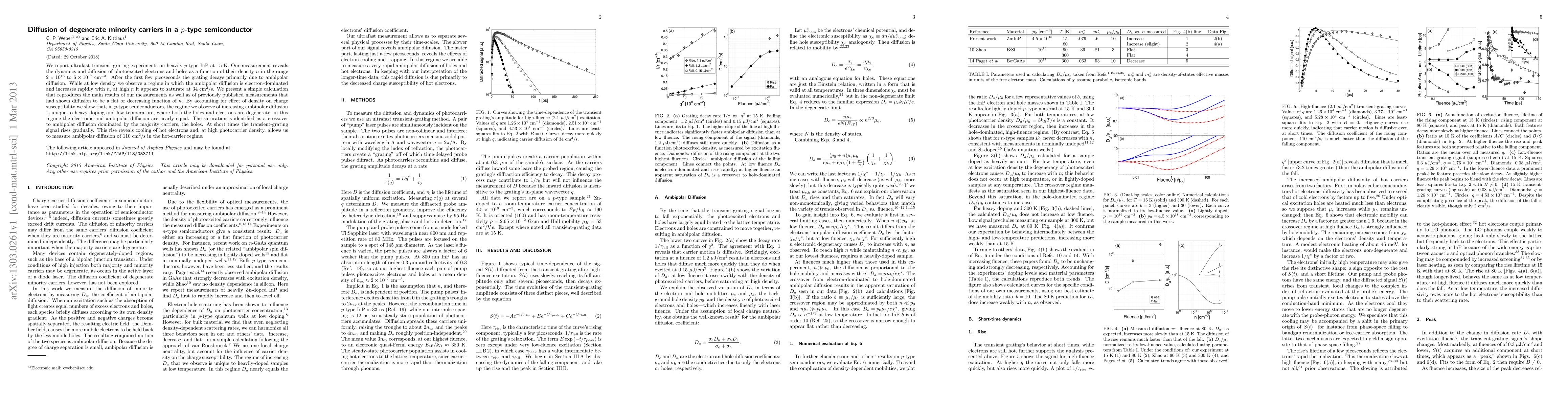 We report ultrafast transient-grating experiments on heavily p-type InP at 15 K. Our measurement reveals the dynamics and diffusion of photoexcited electrons and holes as a function of their density n in the range 2E16 to 6E17 cm-3. After the first few picoseconds the grating decays primarily due to ambipolar diffusion. While at low density we observe a regime in which the ambipolar diffusion is electron-dominated and increases rapidly with n, at high n it appears to saturate at 34 cm2/s. We present a simple calculation that reproduces the main results of our measurements as well as of previously published measurements that had shown diffusion to be a flat or decreasing function of n. By accounting for effect of density on charge susceptibility we show that, in p-type semiconductors, the regime we observe of increasing ambipolar diffusion is unique to heavy doping and low temperature, where both the holes and electrons are degenerate; in this regime the electronic and ambipolar diffusion are nearly equal. The saturation is identified as a crossover to ambipolar diffusion dominated by the majority carriers, the holes. At short times the transient-grating signal rises gradually. This rise reveals cooling of hot electrons and, at high photocarrier density, allows us to measure ambipolar diffusion of 110 cm2/s in the hot-carrier regime.