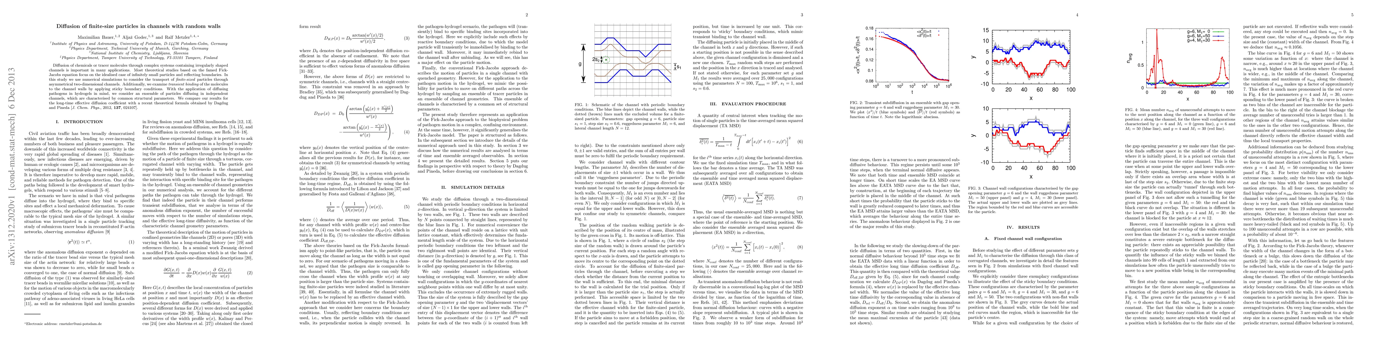 Diffusion of chemicals or tracer molecules through complex systems containing irregularly shaped channels is important in many applications. Most theoretical studies based on the famed Fick-Jacobs equation focus on the idealised case of infinitely small particles and reflecting boundaries. In this study we use numerical simulations to consider the transport of finite-sized particles through asymmetrical two-dimensional channels. Additionally, we examine transient binding of the molecules to the channel walls by applying sticky boundary conditions. With the application of diffusing pathogens in hydrogels in mind, we consider an ensemble of particles diffusing in independent channels, which are characterised by common structural parameters. We compare our results for the long-time effective diffusion coefficient with a recent theoretical formula obtained by Dagdug and Pineda [J. Chem. Phys., 2012, 137, 024107].