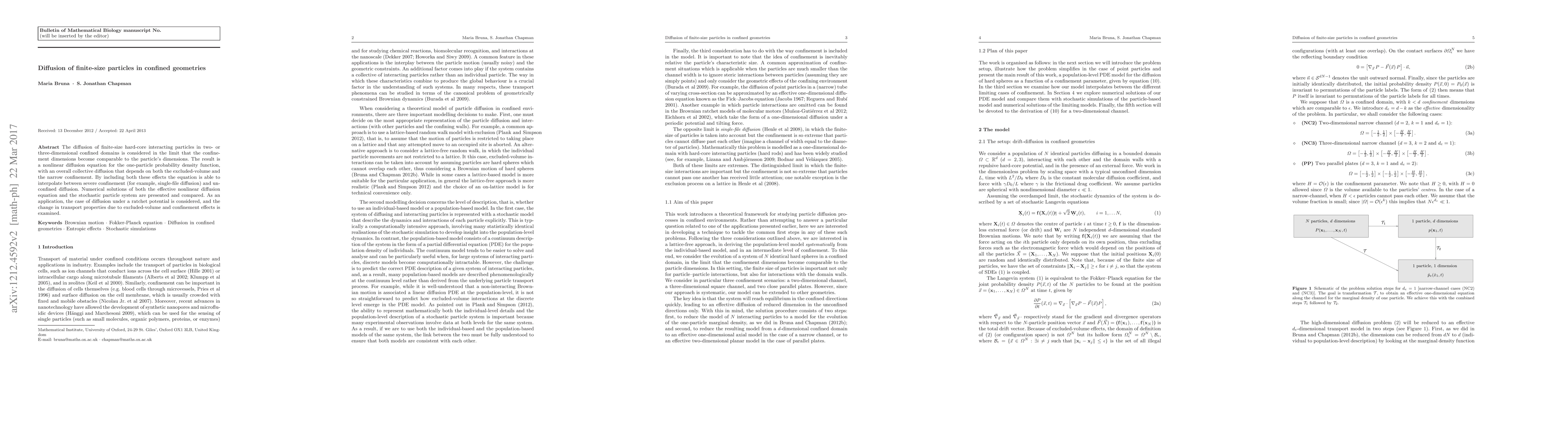 This paper investigates the diffusion of finite-size particles in confined geometries, deriving a nonlinear diffusion equation that accounts for both excluded-volume and confinement effects. The study compares numerical solutions of the derived equation with stochastic particle simulations, highlighting the transition between severe confinement and unconfined diffusion.
