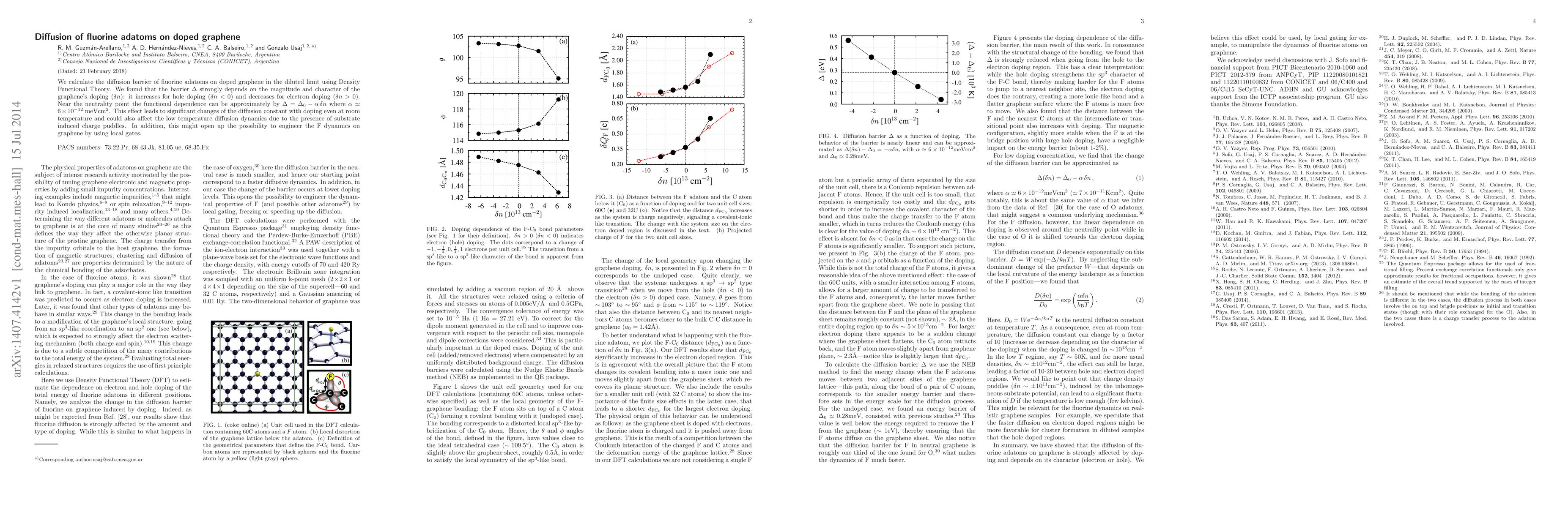 This study uses Density Functional Theory to investigate how doping affects the diffusion barrier of fluorine adatoms on graphene. The findings indicate that the diffusion barrier decreases with electron doping and increases with hole doping, suggesting potential for engineering fluorine dynamics on graphene via local gates.