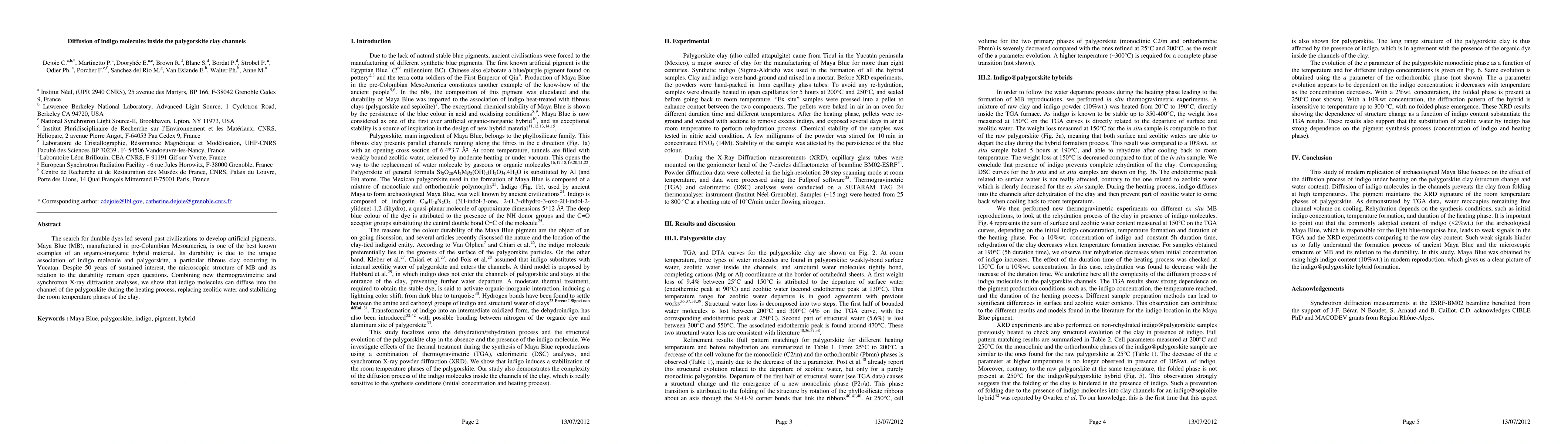 The search for durable dyes led several past civilizations to develop artificial pigments. Maya Blue (MB), manufactured in pre-Columbian Mesoamerica, is one of the best known examples of an organic-inorganic hybrid material. Its durability is due to the unique association of indigo molecule and palygorskite, a particular fibrous clay occurring in Yucatan. Despite 50 years of sustained interest, the microscopic structure of MB and its relation to the durability remain open questions. Combining new thermogravimetric and synchrotron X-ray diffraction analyses, we show that indigo molecules can diffuse into the channel of the palygorskite during the heating process, replacing zeolitic water and stabilizing the room temperature phases of the clay.
