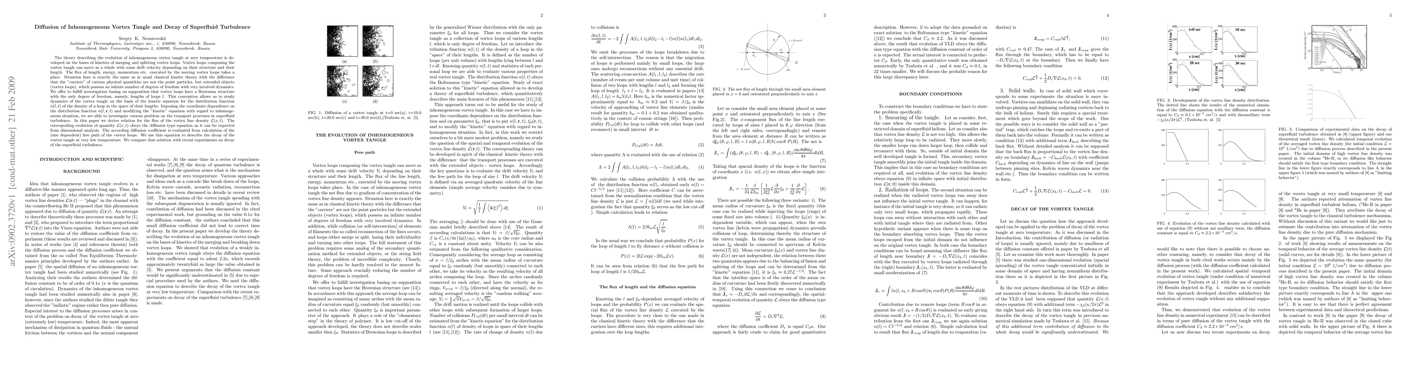 The theory describing the evolution of inhomogeneous vortex tangle at zero temperature is developed on the bases of kinetics of merging and splitting vortex loops. Vortex loops composing the vortex tangle can move as a whole with some drift velocity depending on their structure and their length. The flux of length, energy, momentum etc. executed by the moving vortex loops takes a place. Situation here is exactly the same as in usual classical kinetic theory with the difference that the "carriers" of various physical quantities are not the point particles, but extended objects (vortex loops), which possess an infinite number of degrees of freedom with very involved dynamics. We offer to fulfill investigation basing on supposition that vortex loops have a Brownian structure with the only degree of freedom, namely, lengths of loops $l$. This conception allows us to study dynamics of the vortex tangle on the basis of the kinetic equation for the distribution function $n(l,t)$ of the density of a loop in the space of their lengths. Imposing the coordinate dependence on the distribution function $n(l,\mathbf{% r},t)$ and modifying the "kinetic" equation with regard to inhomogeneous situation, we are able to investigate various problem on the transport processes in superfluid turbulence. In this paper we derive relation for the flux of the vortex line density $\mathcal{L}(x,t)$. The correspoding evolution of quantity $\mathcal{L}(x,t)$ obeys the diffusion type equation as it can be expected from dimensional analysis. The according diffusion coefficient is evaluated from calculation of the (size dependent) free path of the vortex loops. We use this equation to describe the decay of the vortex tangle at very low temperature. We compare that solution with recent experiments on decay of the superfluid turbulence.