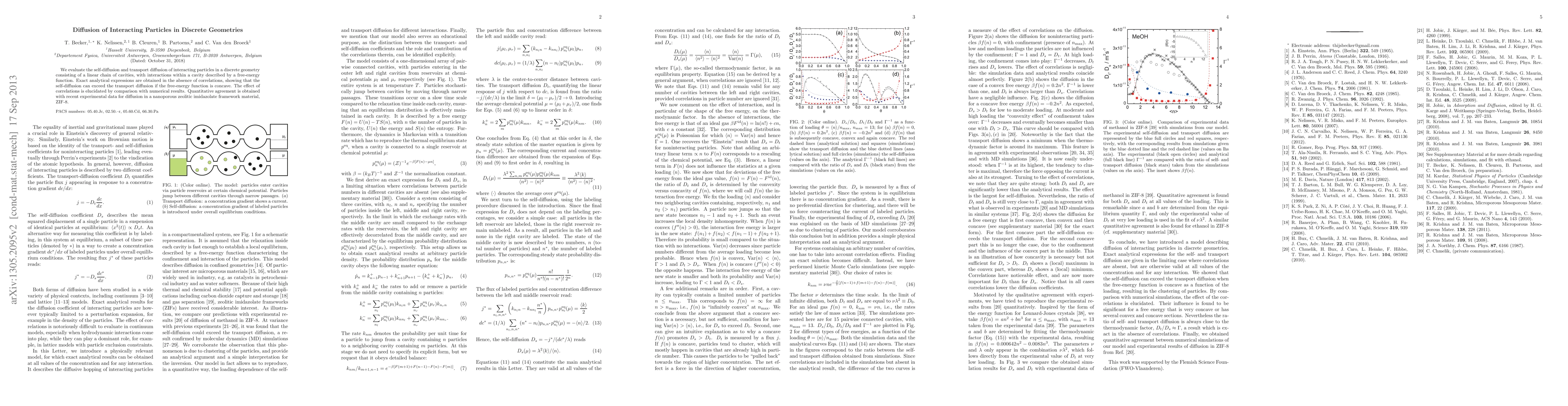 Researchers studied the diffusion of interacting particles in a discrete geometry, finding that self-diffusion can exceed transport diffusion under certain conditions, with quantitative agreement with experimental data for a specific material.