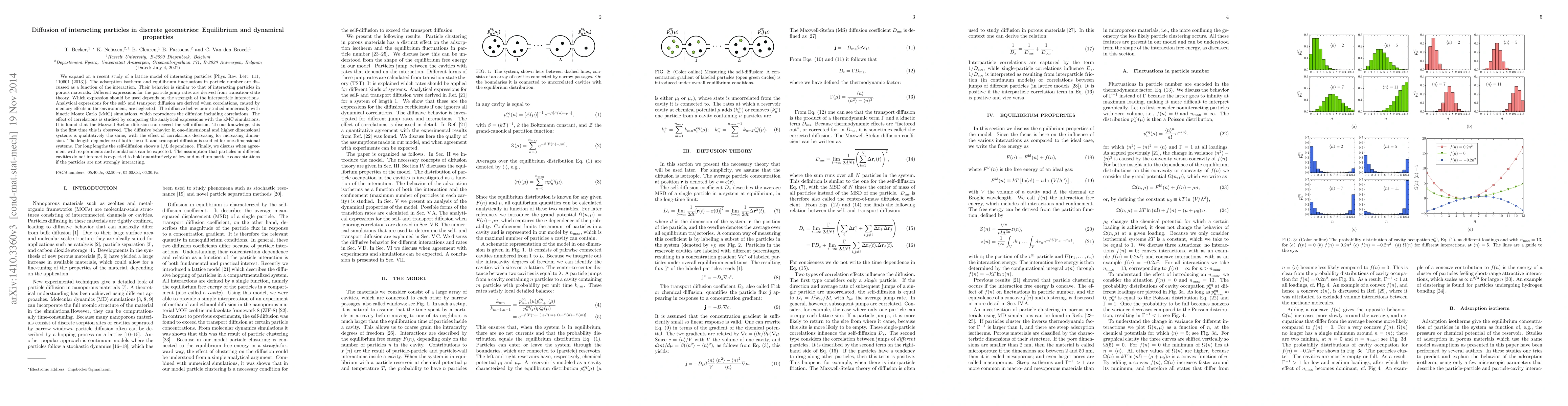 We expand on a recent study of a lattice model of interacting particles [Phys. Rev. Lett. 111, 110601 (2013)]. The adsorption isotherm and equilibrium fluctuations in particle number are discussed as a function of the interaction. Their behavior is similar to that of interacting particles in porous materials. Different expressions for the particle jump rates are derived from transition state theory. Which expression should be used depends on the strength of the inter-particle interactions. Analytical expressions for the self- and transport diffusion are derived when correlations, caused by memory effects in the environment, are neglected. The diffusive behavior is studied numerically with kinetic Monte Carlo (kMC) simulations, which reproduces the diffusion including correlations. The effect of correlations is studied by comparing the analytical expressions with the kMC simulations. It is found that the Maxwell-Stefan diffusion can exceed the self-diffusion. To our knowledge, this is the first time this is observed. The diffusive behavior in one-dimensional and higher dimensional systems is qualitatively the same, with the effect of correlations decreasing for increasing dimension. The length dependence of both the self- and transport diffusion is studied for one-dimensional systems. For long lengths the self-diffusion shows a one over length dependence. Finally, we discuss when agreement with experiments and simulations can be expected. The assumption that particles in different cavities do not interact is expected to hold quantitatively at low and medium particle concentrations, if the particles are not strongly interacting.