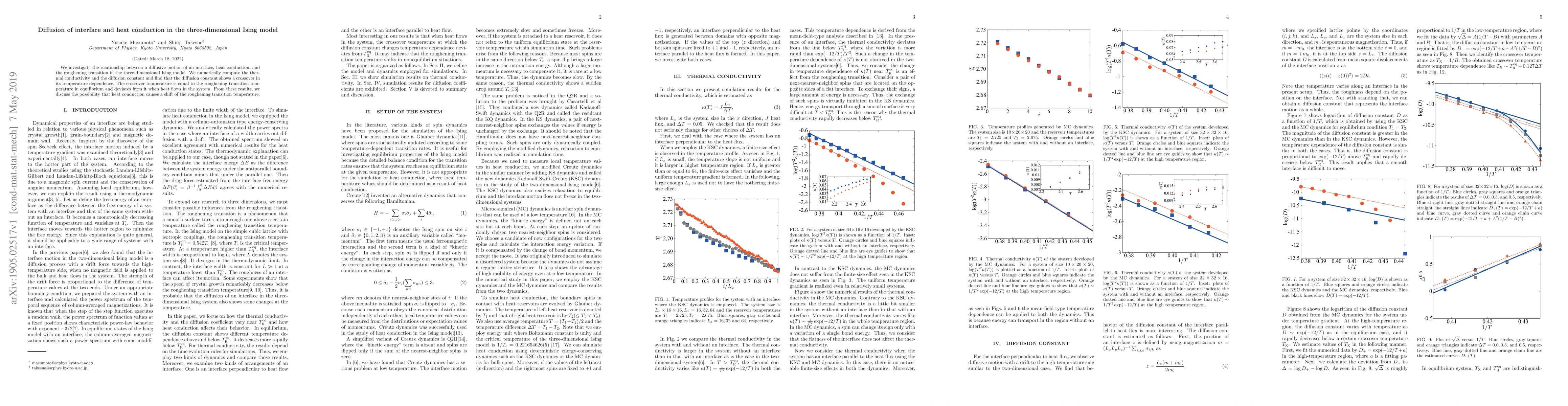 This study numerically examines the interplay between interface diffusion, heat conduction, and the roughening transition in the three-dimensional Ising model, revealing a crossover in the diffusion constant's temperature dependence that aligns with the roughening transition temperature in equilibrium but shifts under heat flow.