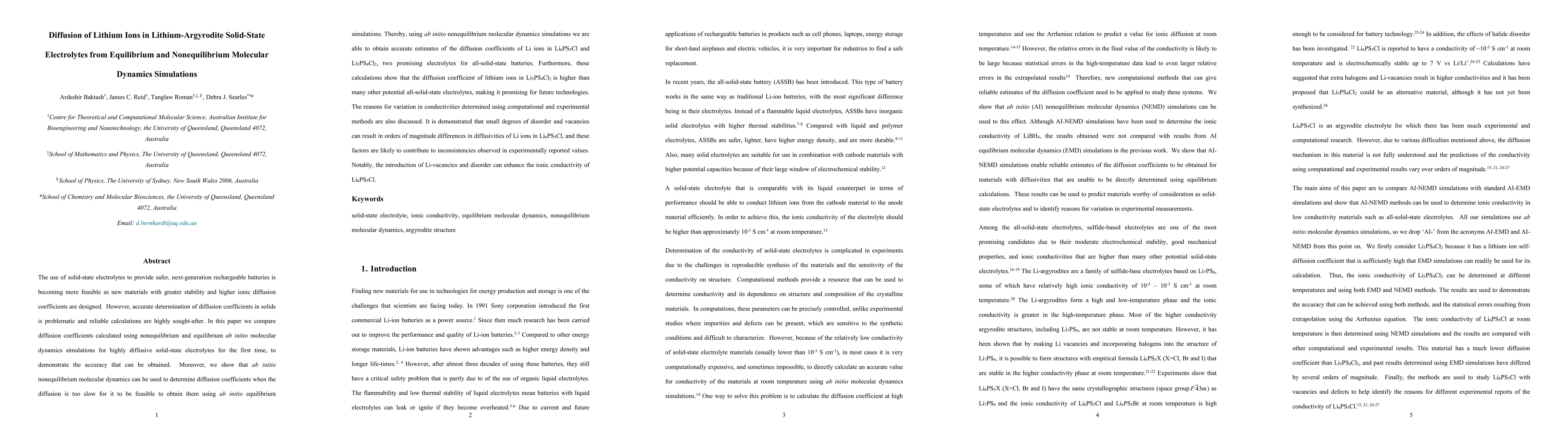 The use of solid-state electrolytes to provide safer, next-generation rechargeable batteries is becoming more feasible as new materials with greater stability and higher ionic diffusion coefficients are designed. However, accurate determination of diffusion coefficients in solids is problematic and reliable calculations are highly sought-after. In this paper we compare diffusion coefficients calculated using nonequilibrium and equilibrium ab initio molecular dynamics simulations for highly diffusive solid-state electrolytes for the first time, to demonstrate the accuracy that can be obtained. Moreover, we show that ab initio nonequilibrium molecular dynamics can be used to determine diffusion coefficients when the diffusion is too slow for it to be feasible to obtain them using ab initio equilibrium simulations. Thereby, using ab initio nonequilibrium molecular dynamics simulations we are able to obtain accurate estimates of the diffusion coefficients of Li ions in Li$_6$PS$_5$Cl and Li$_5$PS$_4$Cl$_2$, two promising electrolytes for all-solid-state batteries. Furthermore, these calculations show that the diffusion coefficient of lithium ions in Li$_5$PS$_4$Cl$_2$ is higher than many other potential all-solid-state electrolytes, making it promising for future technologies. The reasons for variation in conductivities determined using computational and experimental methods are also discussed. It is demonstrated that small degrees of disorder and vacancies can result in orders of magnitude differences in diffusivities of Li ions in Li$_6$PS$_5$Cl, and these factors are likely to contribute to inconsistencies observed in experimentally reported values. Notably, the introduction of Li-vacancies and disorder can enhance the ionic conductivity of Li$_6$PS$_5$Cl.
