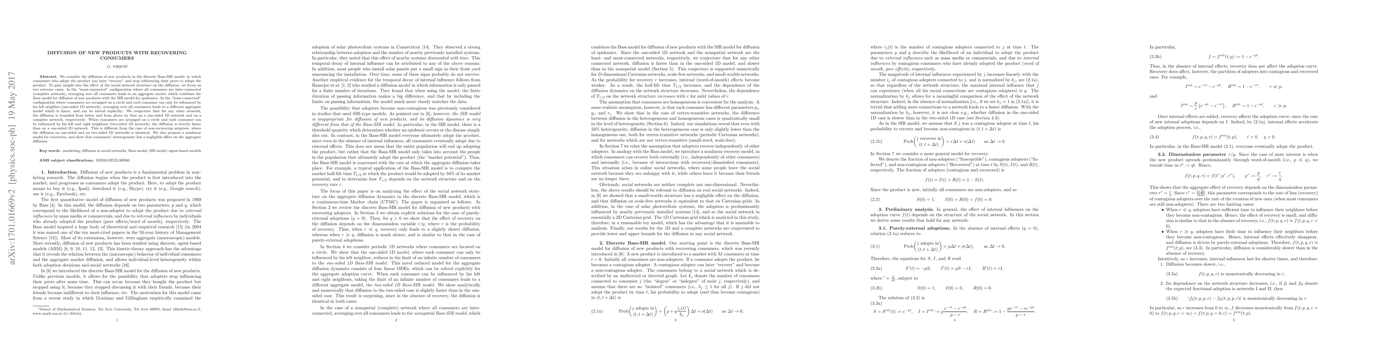 We consider the diffusion of new products in the discrete Bass-SIR model, in which consumers who adopt the product can later "recover" and stop influencing their peers to adopt the product. To gain insight into the effect of the social network structure on the diffusion, we focus on two extreme cases. In the "most-connected" configuration where all consumers are inter-connected (complete network), averaging over all consumers leads to an aggregate model, which combines the Bass model for diffusion of new products with the SIR model for epidemics. In the "least-connected" configuration where consumers are arranged on a circle and each consumer can only be influenced by his left neighbor (one-sided 1D network), averaging over all consumers leads to a different aggregate model which is linear, and can be solved explicitly. We conjecture that for any other network, the diffusion is bounded from below and from above by that on a one-sided 1D network and on a complete network, respectively. When consumers are arranged on a circle and each consumer can be influenced by his left and right neighbors (two-sided 1D network), the diffusion is strictly faster than on a one-sided 1D network. This is different from the case of non-recovering adopters, where the diffusion on one-sided and on two-sided 1D networks is identical. We also propose a nonlinear model for recoveries, and show that consumers' heterogeneity has a negligible effect on the aggregate diffusion.