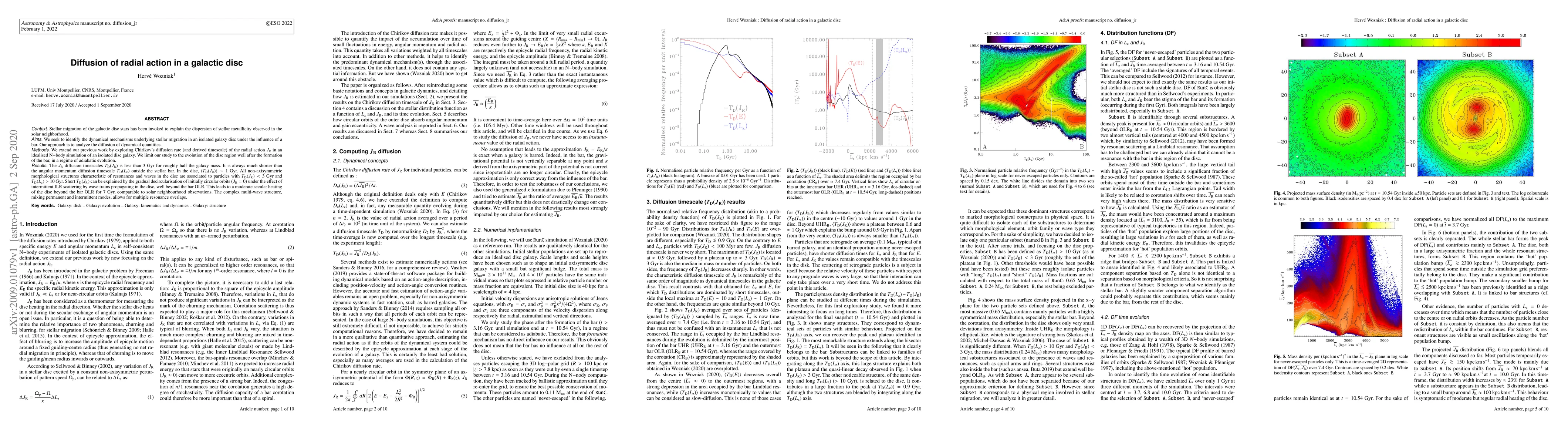 Context. Stellar migration of the galactic disc stars has been invoked to explain the dispersion of stellar metallicity observed in the solar neighborhood. Aims. We seek to identify the dynamical mechanisms underlying stellar migration in an isolated galaxy disc under the influence of a bar. Our approach is to analyze the diffusion of dynamical quantities. Methods. We extend our previous work by exploring Chirikov's diffusion rate (and derived timescale) of the radial action $J_\mathrm{R}$ in an idealised N$-$body simulation of an isolated disc galaxy. We limit our study to the evolution of the disc region well after the formation of the bar, in a regime of adiabatic evolution. Results. The $J_\mathrm{R}$ diffusion timescales $T_\mathrm{D}(J_\mathrm{R})$ is less than 3 Gyr for roughly half the galaxy mass. It is always much shorter than the angular momentum diffusion timescale $T_\mathrm{D}(L_\mathrm{z})$ outside the stellar bar. In the disc, $\langle T_\mathrm{D}(J_\mathrm{R}) \rangle \sim 1$ Gyr. All non-axisymmetric morphological structures characteristic of resonances and waves in the disc are associated to particles with $T_\mathrm{D}(J_\mathrm{R}) < 3$ Gyr and $T_\mathrm{D}(L_\mathrm{z}) > 10$ Gyr. Short $T_\mathrm{D}(J_\mathrm{R})$ can be explained by the gradual decircularisation of initially circular orbits ($J_\mathrm{R}=0$) under the effect of intermittent ILR scattering by wave trains propagating in the disc, well beyond the bar OLR. This leads to a moderate secular heating of the disc beyond the bar OLR for 7 Gyr, comparable to solar neighbourhood observations. The complex multi-wave structure, mixing permanent and intermittent modes, allows for multiple resonance overlaps.