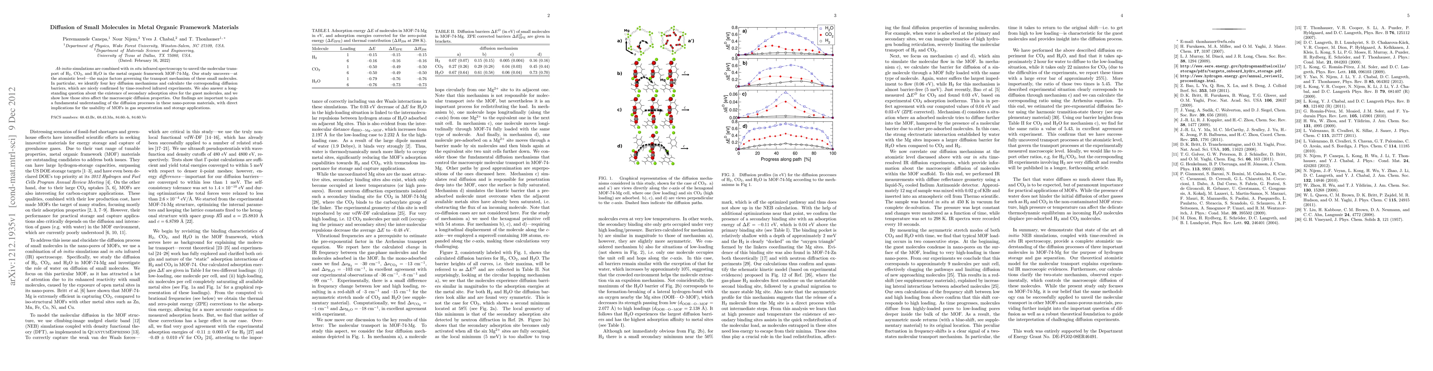 Ab initio simulations are combined with in situ infrared spectroscopy to unveil the molecular transport of H$_2$, CO$_2$, and H$_2$O in the metal organic framework MOF-74-Mg. Our study uncovers---at the atomistic level---the major factors governing the transport mechanism of these small molecules. In particular, we identify four key diffusion mechanisms and calculate the corresponding diffusion barriers, which are nicely confirmed by time-resolved infrared experiments. We also answer a long-standing question about the existence of secondary adsorption sites for the guest molecules, and we show how those sites affect the macroscopic diffusion properties. Our findings are important to gain a fundamental understanding of the diffusion processes in these nano-porous materials, with direct implications for the usability of MOFs in gas sequestration and storage applications.