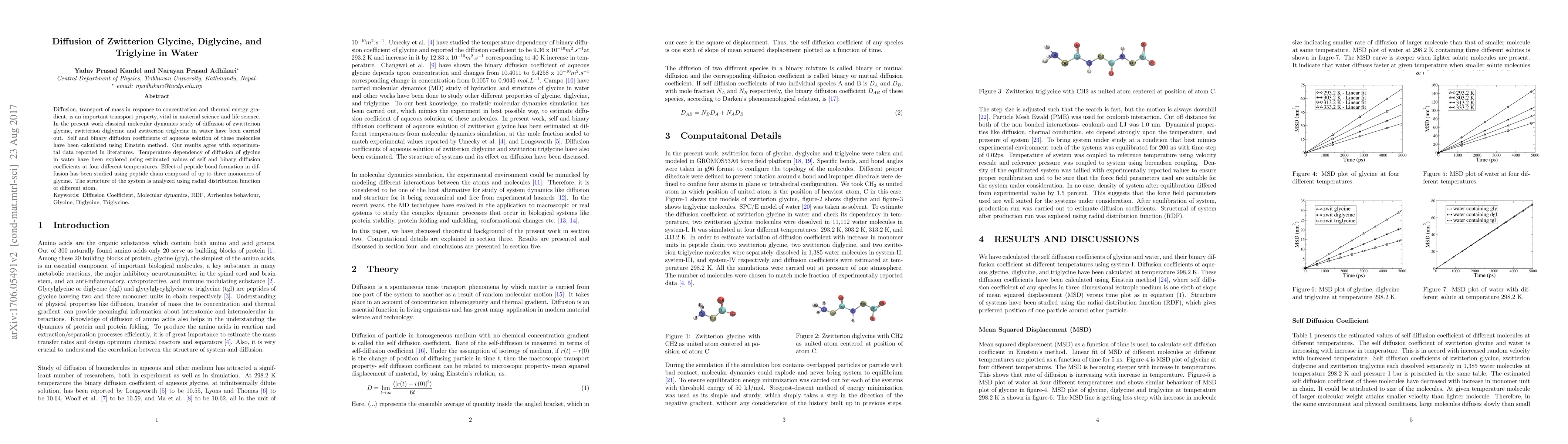 This study uses molecular dynamics to analyze the diffusion of zwitterionic glycine, diglycine, and triglycine in water. Results align with experimental data and reveal temperature dependency of glycine diffusion. The impact of peptide bond formation on diffusion is also explored, with structural analysis through radial distribution functions.