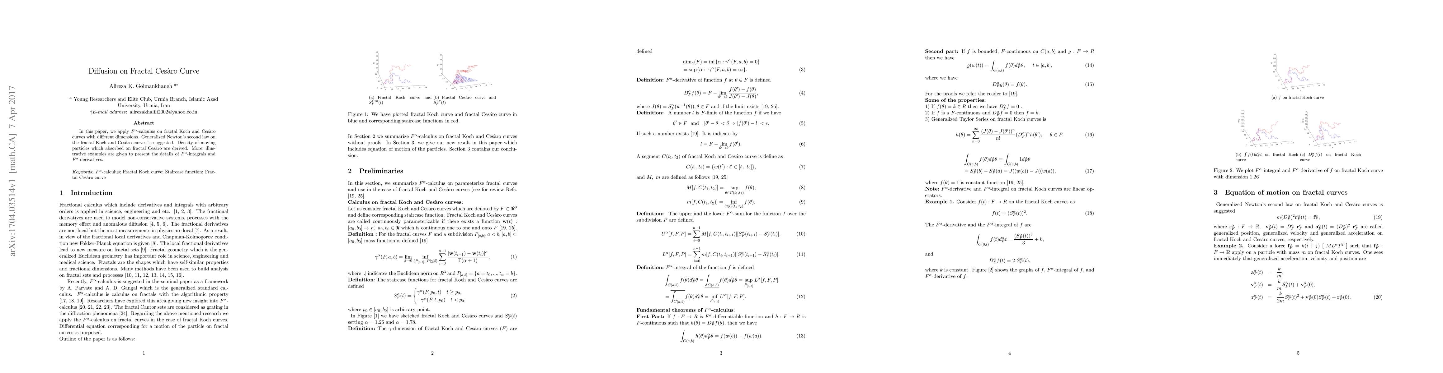 In this paper, we apply F-calculus on fractal Koch and Ces\`aro curves with different dimensions. Generalized Newton's second law on the fractal Koch and Ces\`aro curves is suggested. Density of moving particles which absorbed on fractal Ces\`aro are derived. More, illustrative examples are given to present the details of F-integrals and F-derivatives.