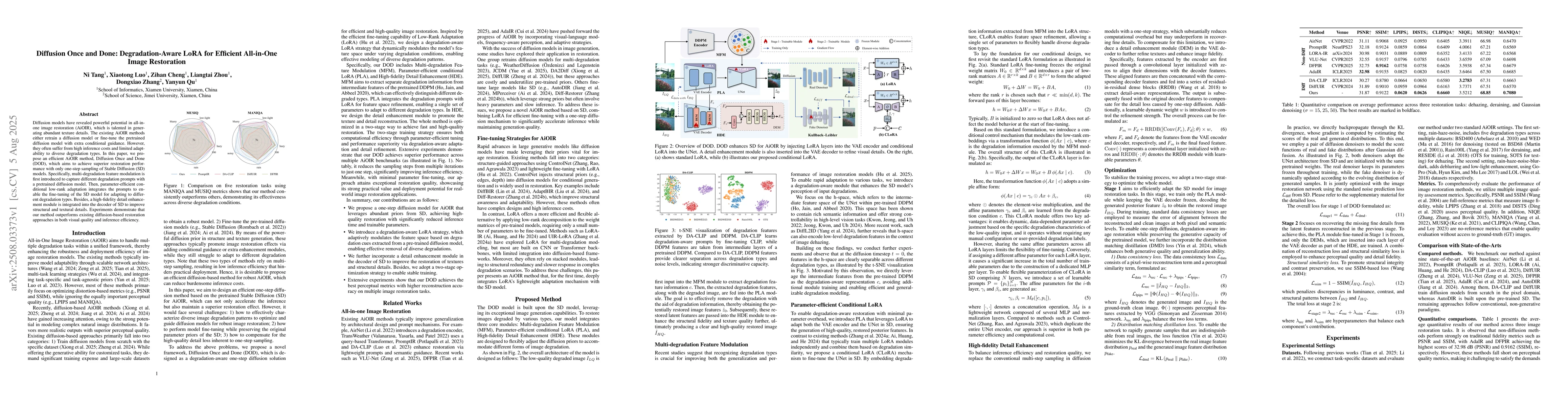 Diffusion models have revealed powerful potential in all-in-one image restoration (AiOIR), which is talented in generating abundant texture details. The existing AiOIR methods either retrain a diffusion model or fine-tune the pretrained diffusion model with extra conditional guidance. However, they often suffer from high inference costs and limited adaptability to diverse degradation types. In this paper, we propose an efficient AiOIR method, Diffusion Once and Done (DOD), which aims to achieve superior restoration performance with only one-step sampling of Stable Diffusion (SD) models. Specifically, multi-degradation feature modulation is first introduced to capture different degradation prompts with a pretrained diffusion model. Then, parameter-efficient conditional low-rank adaptation integrates the prompts to enable the fine-tuning of the SD model for adapting to different degradation types. Besides, a high-fidelity detail enhancement module is integrated into the decoder of SD to improve structural and textural details. Experiments demonstrate that our method outperforms existing diffusion-based restoration approaches in both visual quality and inference efficiency.