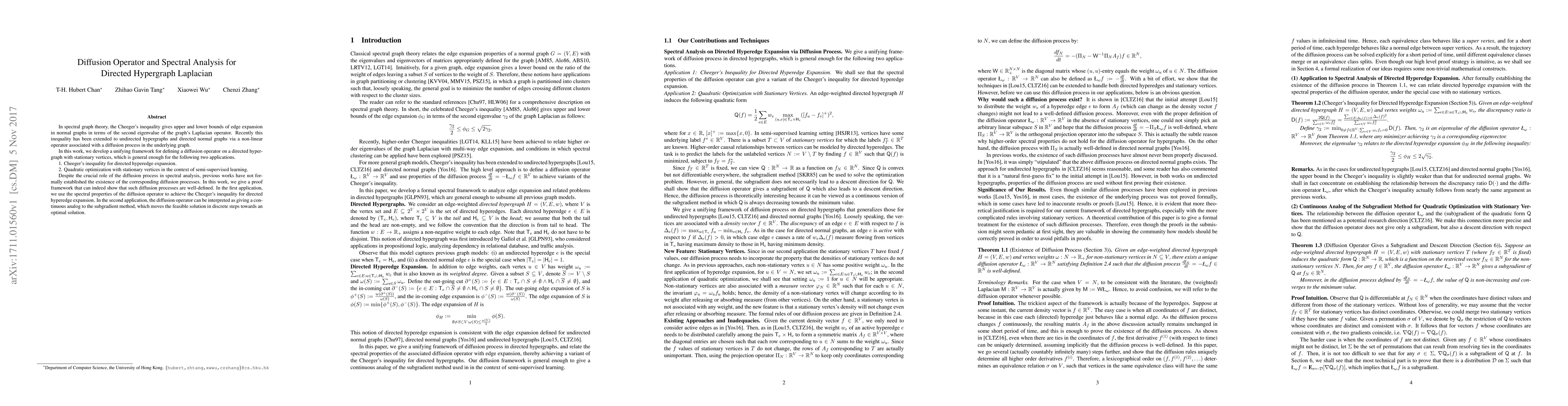 In spectral graph theory, the Cheeger's inequality gives upper and lower bounds of edge expansion in normal graphs in terms of the second eigenvalue of the graph's Laplacian operator. Recently this inequality has been extended to undirected hypergraphs and directed normal graphs via a non-linear operator associated with a diffusion process in the underlying graph. In this work, we develop a unifying framework for defining a diffusion operator on a directed hypergraph with stationary vertices, which is general enough for the following two applications. 1. Cheeger's inequality for directed hyperedge expansion. 2. Quadratic optimization with stationary vertices in the context of semi-supervised learning. Despite the crucial role of the diffusion process in spectral analysis, previous works have not formally established the existence of the corresponding diffusion processes. In this work, we give a proof framework that can indeed show that such diffusion processes are well-defined. In the first application, we use the spectral properties of the diffusion operator to achieve the Cheeger's inequality for directed hyperedge expansion. In the second application, the diffusion operator can be interpreted as giving a continuous analog to the subgradient method, which moves the feasible solution in discrete steps towards an optimal solution.