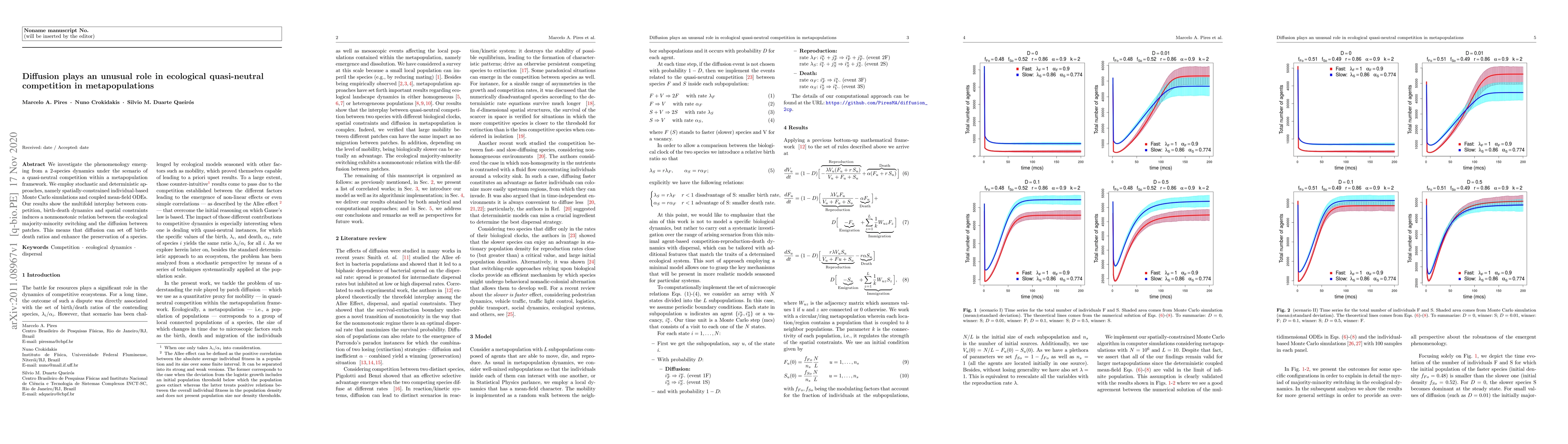 This paper explores the dynamics of quasi-neutral competition between two species in a metapopulation framework, revealing that diffusion unexpectedly influences birth-death ratios and species preservation, leading to a nonmonotonic relationship between ecological switching and diffusion. The study employs both stochastic simulations and deterministic ODEs to uncover these complex interactions.