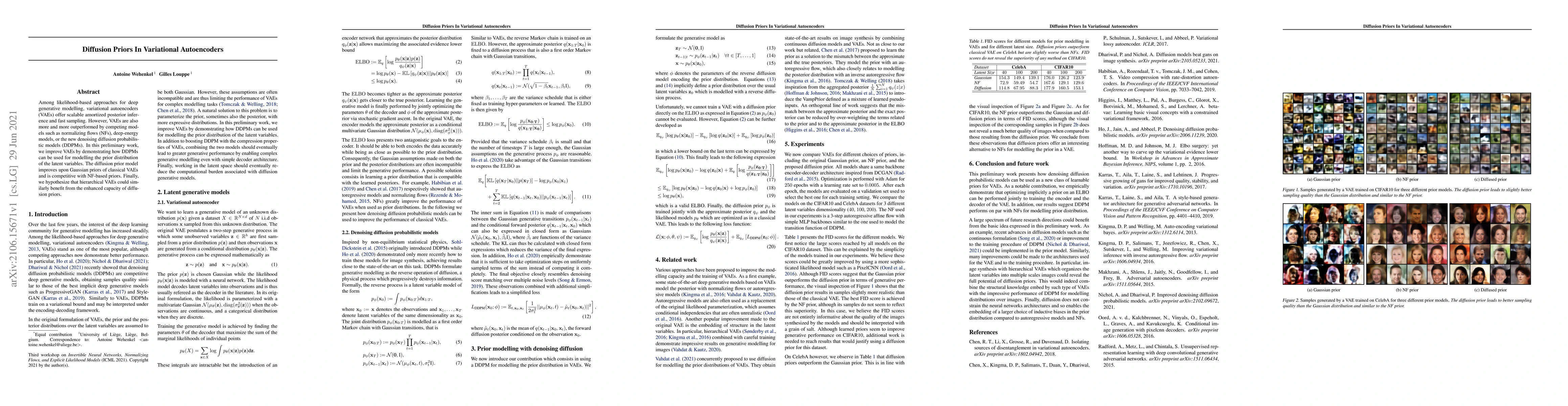 This paper proposes using diffusion priors in variational autoencoders to enhance their generative capabilities, showing that they outperform traditional Gaussian priors and are competitive with normalizing flows. The authors hypothesize that hierarchical VAEs could also benefit from this improved prior modeling.