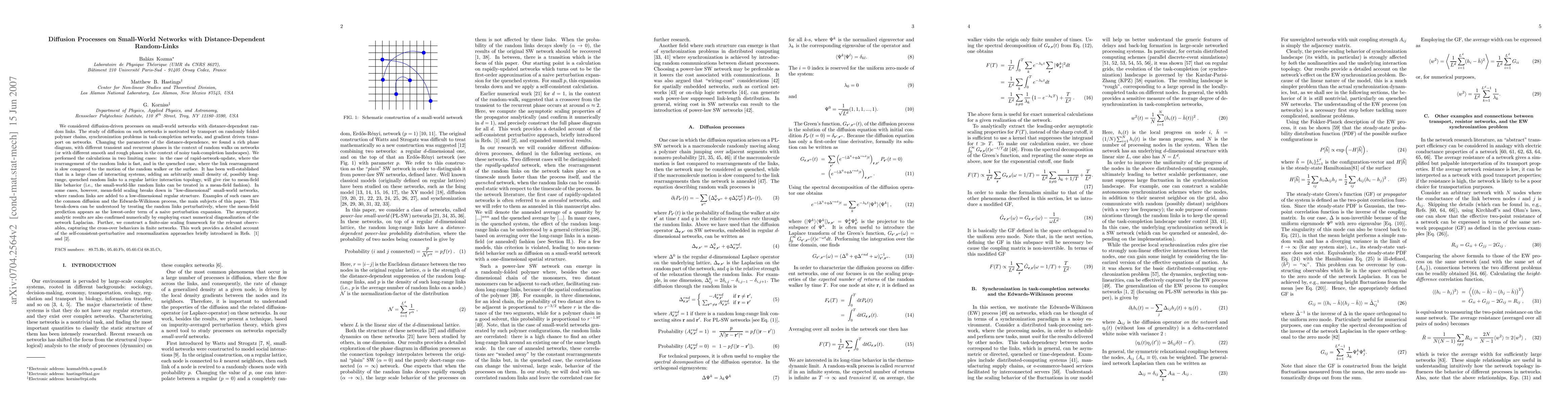 This paper investigates diffusion processes on small-world networks with distance-dependent random links, revealing a rich phase diagram with transient and recurrent phases. It explores both annealed and quenched scenarios, confirming mean-field behavior in some cases and breakdown in others, and uses numerical methods to support analytical results.