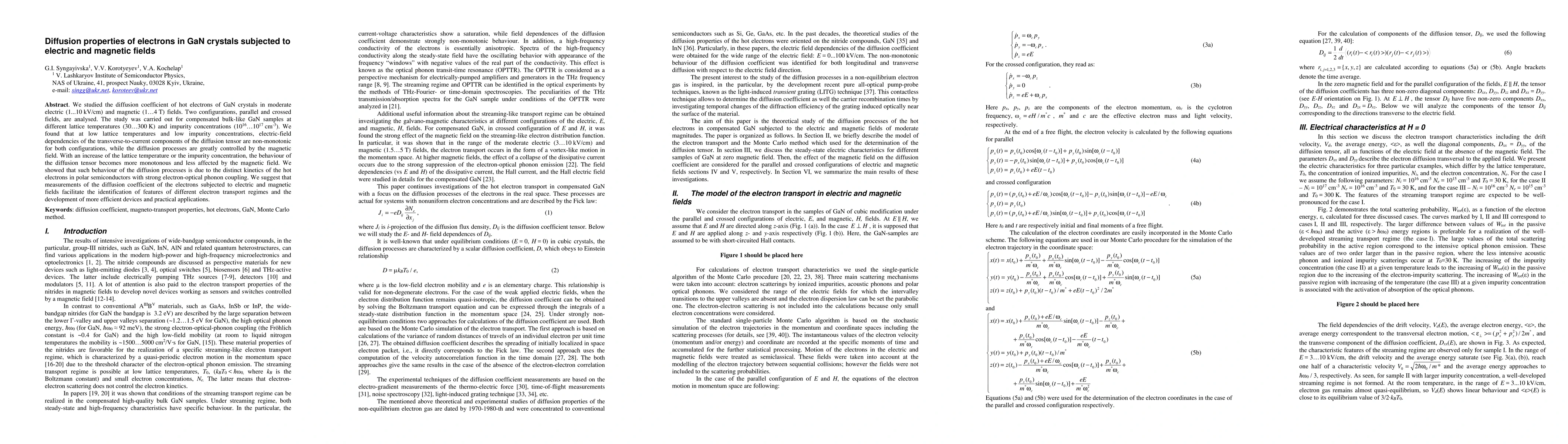 This study investigates the diffusion coefficient of hot electrons in GaN crystals under varying electric and magnetic fields, revealing non-monotonic behavior at low temperatures and low impurity levels influenced by magnetic fields. As temperature and impurity concentration increase, the diffusion becomes more monotonous and less affected by the magnetic field, attributed to the distinct kinetics of hot electrons in polar semiconductors.