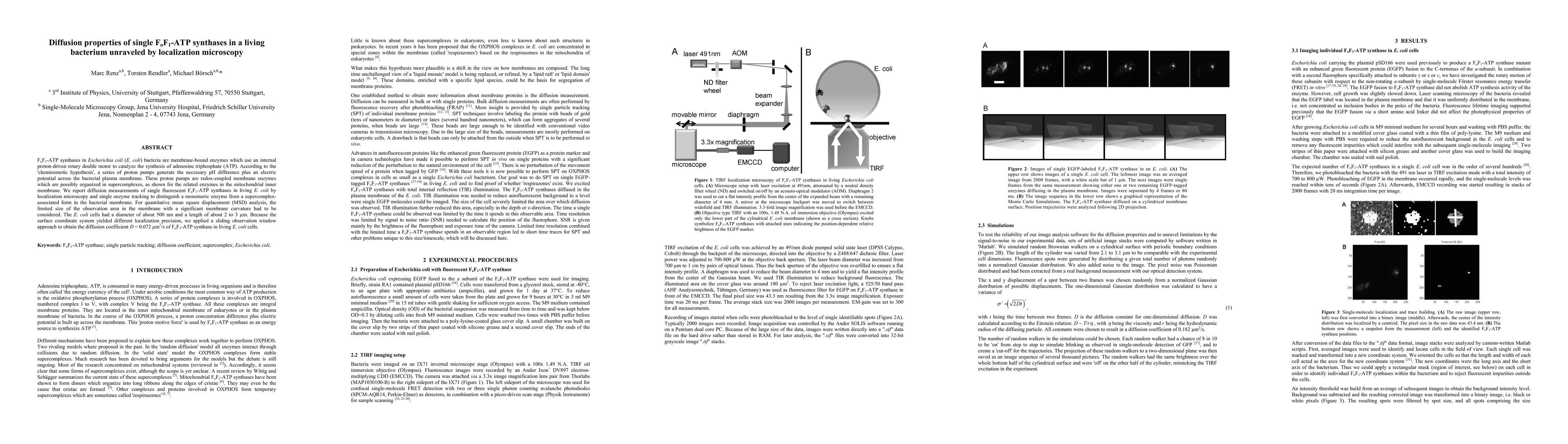 This study uses localization microscopy to measure the diffusion of single FoF1-ATP synthases in living E. coli bacteria, revealing a monomeric form with a diffusion coefficient of 0.072 µm²/s, challenging the hypothesis of supercomplex organization.