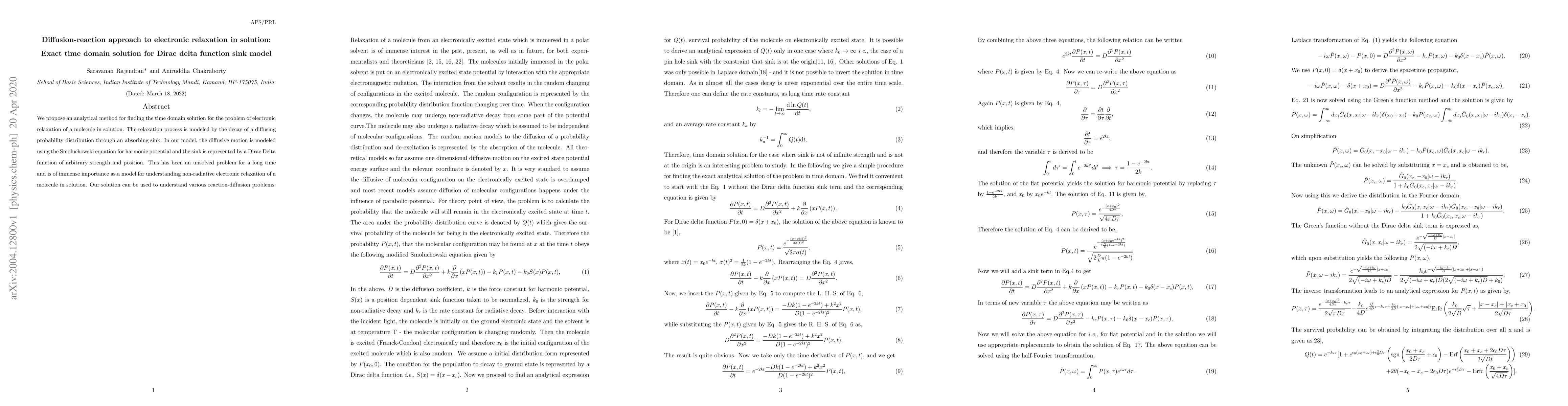 We propose an analytical method for finding the time domain solution for the problem of electronic relaxation of a molecule in solution. The relaxation process is modeled by the decay of a diffusing probability distribution through an absorbing sink. In our model, the diffusive motion is modeled using the Smoluchowski equation for harmonic potential and the sink is represented by a Dirac Delta function of arbitrary strength and position. This has been an unsolved problem for a long time and is of immense importance as a model for understanding non-radiative electronic relaxation of a molecule in solution. Our solution can be used to understand various reaction-diffusion problems.
