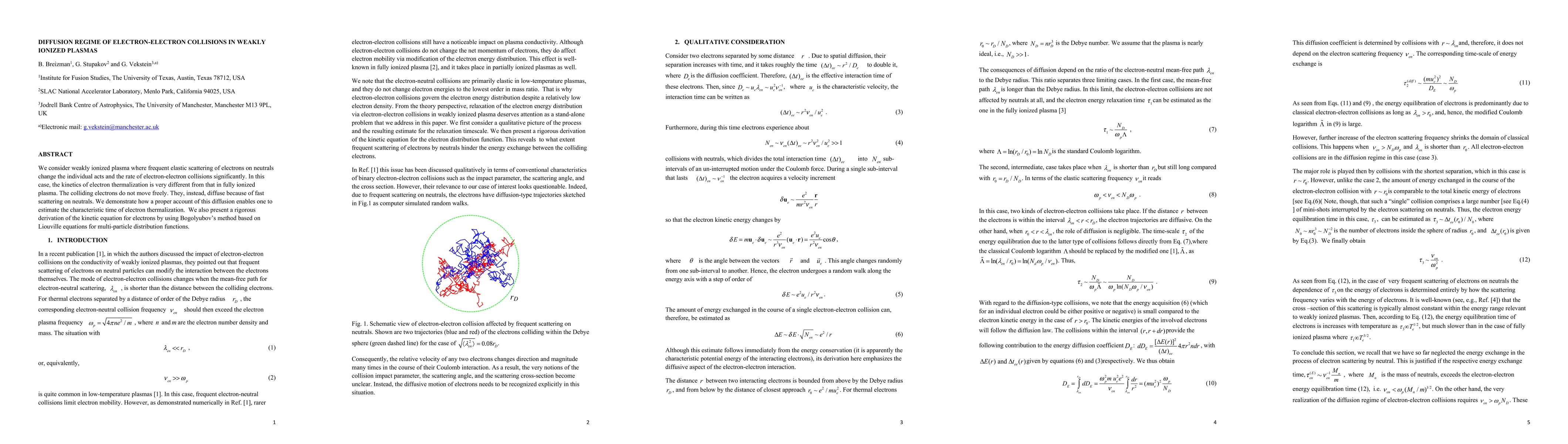 We consider weakly ionized plasma where frequent elastic scattering of electrons on neutrals change the individual acts and the rate of electron-electron collisions significantly. In this case, the kinetics of electron thermalization is very different from that in fully ionized plasma. The colliding electrons diffuse because of fast scattering on neutrals. We demonstrate how a proper account of this diffusion enables one to estimate the characteristic time of electron thermalization. We also present a rigorous derivation of the kinetic equation for electrons by using Bogolyubov method based on Liouville equations for multi-particle distribution functions.