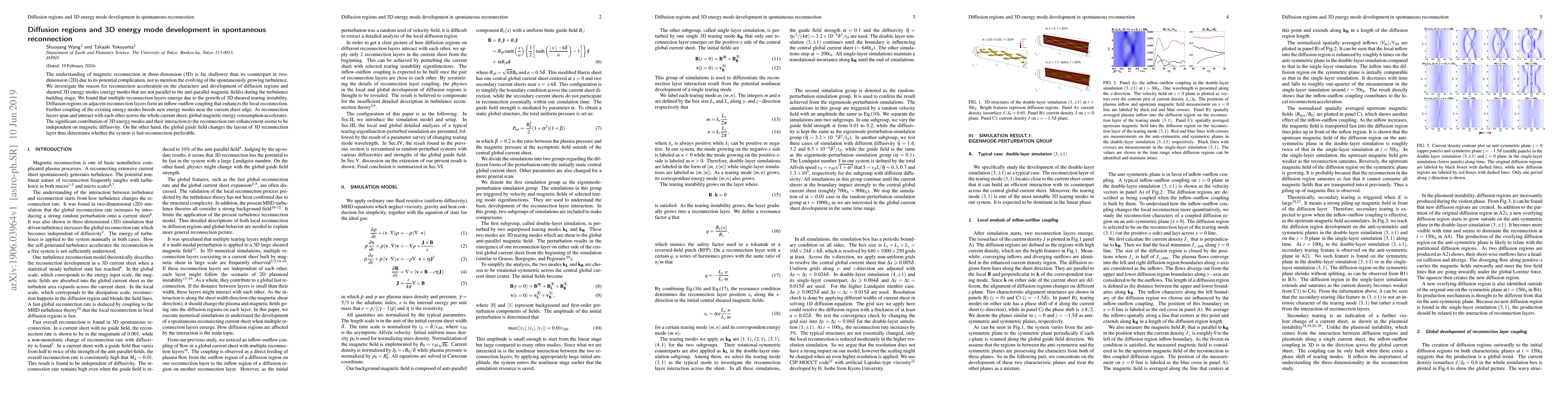 This paper explores the development of diffusion regions and 3D energy modes in spontaneous magnetic reconnection, revealing that multiple reconnection layers emerge due to 3D sheared tearing instability. The interaction of these layers enhances local reconnection and accelerates global magnetic energy consumption, independent of magnetic diffusivity.