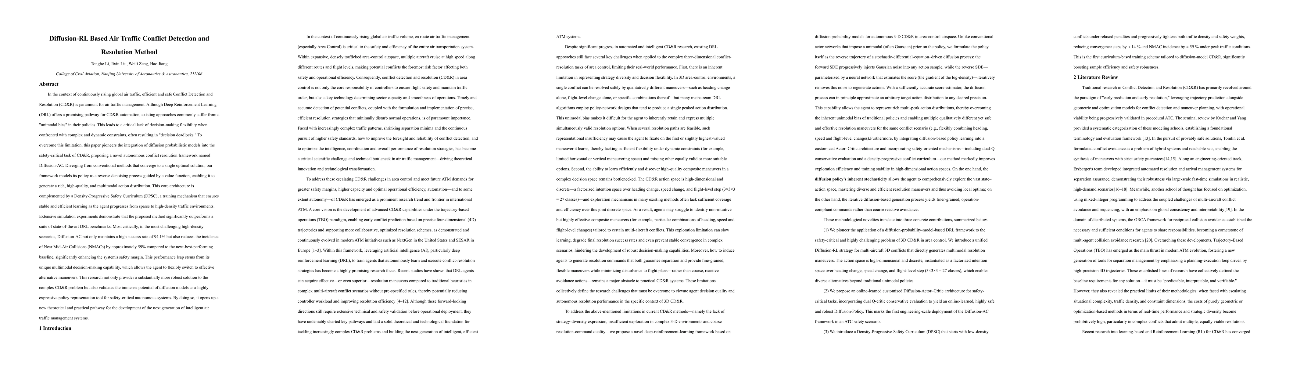 In the context of continuously rising global air traffic, efficient and safe Conflict Detection and Resolution (CD&R) is paramount for air traffic management. Although Deep Reinforcement Learning (DRL) offers a promising pathway for CD&R automation, existing approaches commonly suffer from a "unimodal bias" in their policies. This leads to a critical lack of decision-making flexibility when confronted with complex and dynamic constraints, often resulting in "decision deadlocks." To overcome this limitation, this paper pioneers the integration of diffusion probabilistic models into the safety-critical task of CD&R, proposing a novel autonomous conflict resolution framework named Diffusion-AC. Diverging from conventional methods that converge to a single optimal solution, our framework models its policy as a reverse denoising process guided by a value function, enabling it to generate a rich, high-quality, and multimodal action distribution. This core architecture is complemented by a Density-Progressive Safety Curriculum (DPSC), a training mechanism that ensures stable and efficient learning as the agent progresses from sparse to high-density traffic environments. Extensive simulation experiments demonstrate that the proposed method significantly outperforms a suite of state-of-the-art DRL benchmarks. Most critically, in the most challenging high-density scenarios, Diffusion-AC not only maintains a high success rate of 94.1% but also reduces the incidence of Near Mid-Air Collisions (NMACs) by approximately 59% compared to the next-best-performing baseline, significantly enhancing the system's safety margin. This performance leap stems from its unique multimodal decision-making capability, which allows the agent to flexibly switch to effective alternative maneuvers.