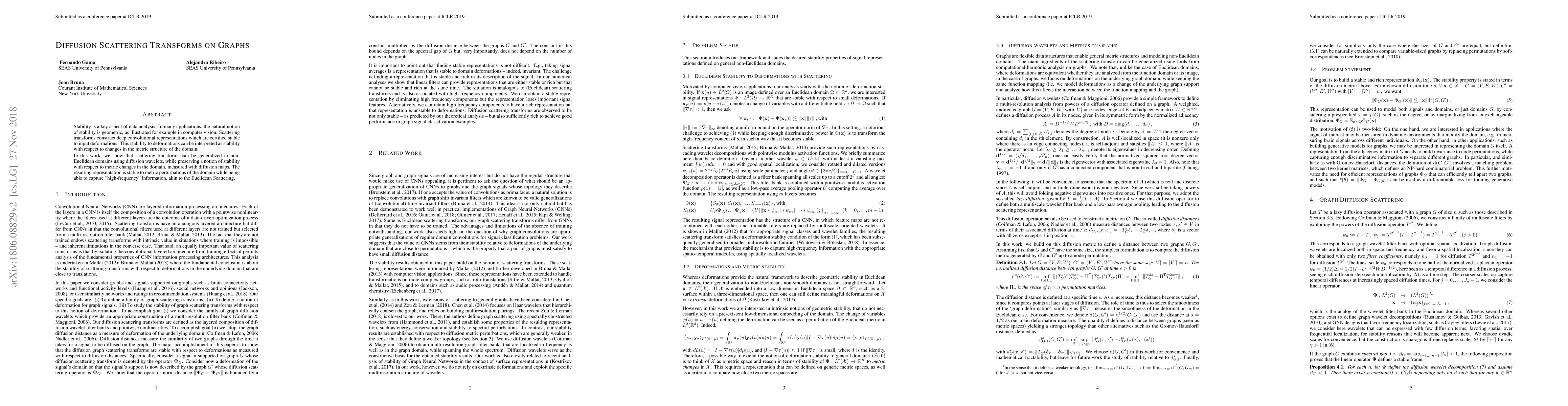 Stability is a key aspect of data analysis. In many applications, the natural notion of stability is geometric, as illustrated for example in computer vision. Scattering transforms construct deep convolutional representations which are certified stable to input deformations. This stability to deformations can be interpreted as stability with respect to changes in the metric structure of the domain. In this work, we show that scattering transforms can be generalized to non-Euclidean domains using diffusion wavelets, while preserving a notion of stability with respect to metric changes in the domain, measured with diffusion maps. The resulting representation is stable to metric perturbations of the domain while being able to capture "high-frequency" information, akin to the Euclidean Scattering.