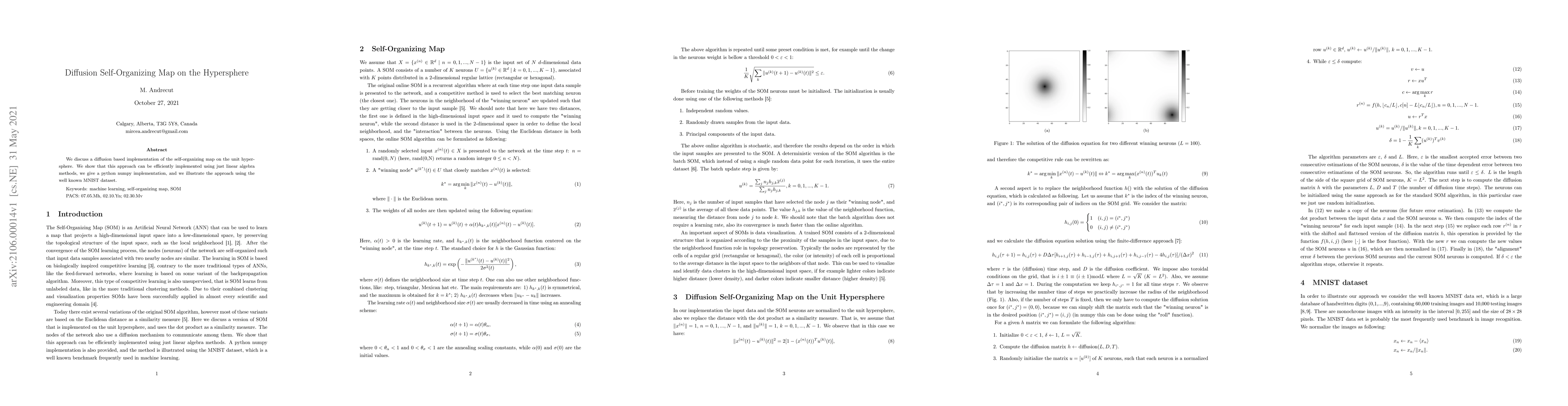 This paper presents a diffusion-based implementation of the self-organizing map on the unit hypersphere, demonstrating efficient linear algebra methods for its execution, and showcases its application using the MNIST dataset with a Python NumPy implementation.