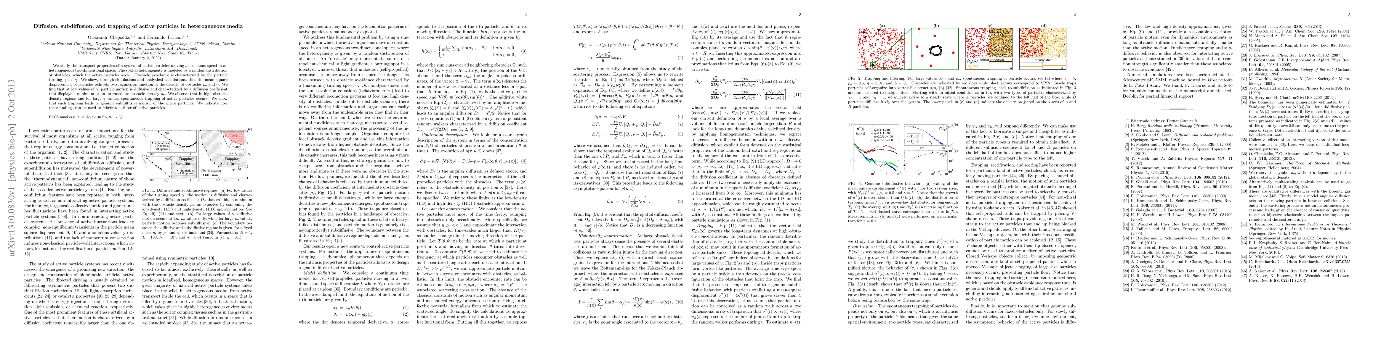 This paper investigates the transport behavior of active particles in heterogeneous environments with randomly distributed obstacles. The study reveals two distinct regimes in particle motion: diffusive at low obstacle densities and subdiffusive with trapping at high densities, providing insights into designing active particle filters.