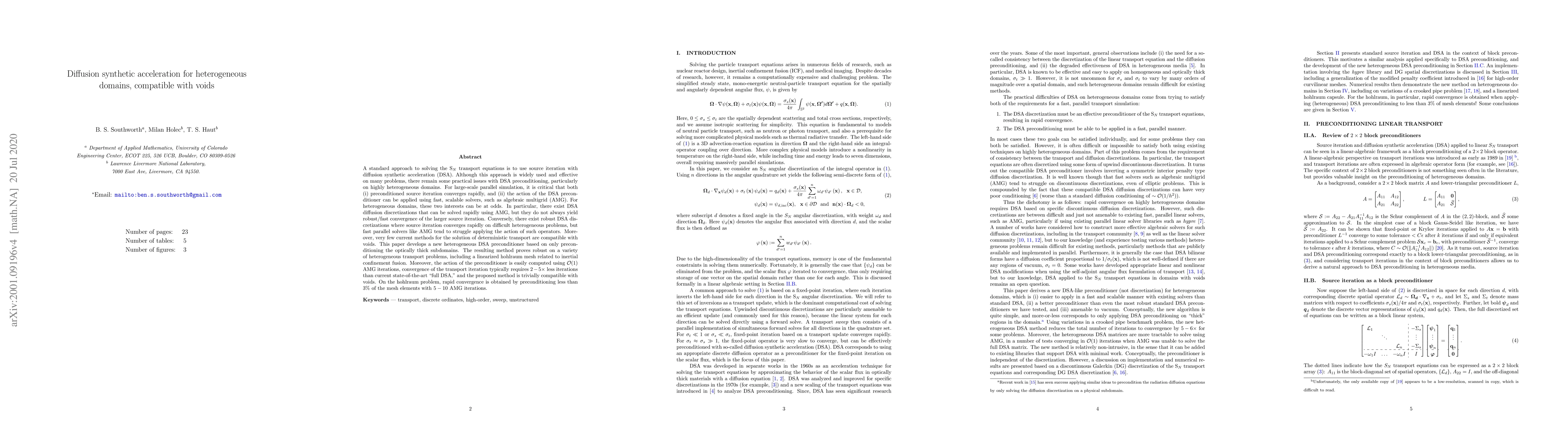A standard approach to solving the S$_N$ transport equations is to use source iteration with diffusion synthetic acceleration (DSA). Although this approach is widely used and effective on many problems, there remain some practical issues with DSA preconditioning, particularly on highly heterogeneous domains. For large-scale parallel simulation, it is critical that both (i) preconditioned source iteration converges rapidly, and (ii) the action of the DSA preconditioner can be applied using fast, scalable solvers, such as algebraic multigrid (AMG). For heterogeneous domains, these two interests can be at odds. In particular, there exist DSA diffusion discretizations that can be solved rapidly using AMG, but they do not always yield robust/fast convergence of the larger source iteration. Conversely, there exist robust DSA discretizations where source iteration converges rapidly on difficult heterogeneous problems, but fast parallel solvers like AMG tend to struggle applying the action of such operators. Moreover, very few current methods for the solution of deterministic transport are compatible with voids. This paper develops a new heterogeneous DSA preconditioner based on only preconditioning the optically thick subdomains. The resulting method proves robust on a variety of heterogeneous transport problems, including a linearized hohlraum mesh related to inertial confinement fusion. Moreover, the action of the preconditioner is easily computed using $\mathcal{O}(1)$ AMG iterations, {convergence of the transport iteration typically requires $2-5\times$ less iterations than current state-of-the-art ``full DSA,'' and the proposed method is} trivially compatible with voids. On the hohlraum problem, rapid convergence is obtained by preconditioning less than 3\% of the mesh elements with $5-10$ AMG iterations.