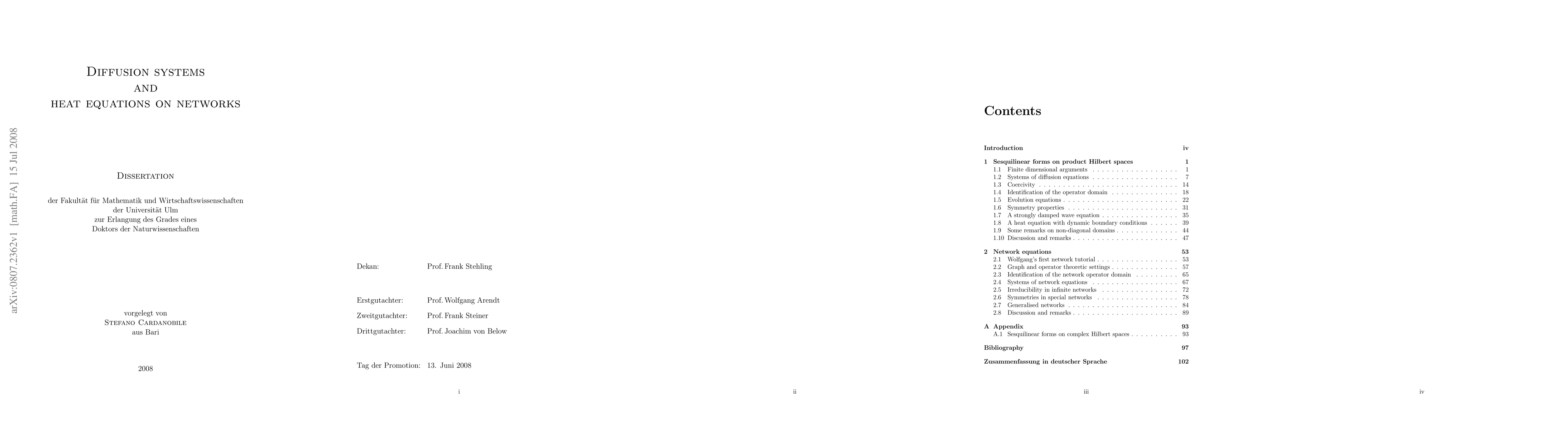 A theoretical framework for sesquilinear forms defined on the direct sum of Hilbert spaces is developed in the first part. Conditions for the boundedness, ellipticity and coercivity of the sesquilinear form are proved. A criterion of E.-M. Ouhabaz is used in order to prove qualitative properties of the abstract Cauchy problem having as generator the operator associated with the sesquilinear form. In the second part we analyze quantum graphs as a special case of forms on subspaces of the direct sum of Hilbert spaces. First, we set up a framework for handling quantum graphs in the case of infinite networks. Then, the operator associated with such systems is identified and investigated. Finally, we turn our attention to symmetry properties of the associated parabolic problem and we investigate the connection with the physical concept of a gauge symmetry.