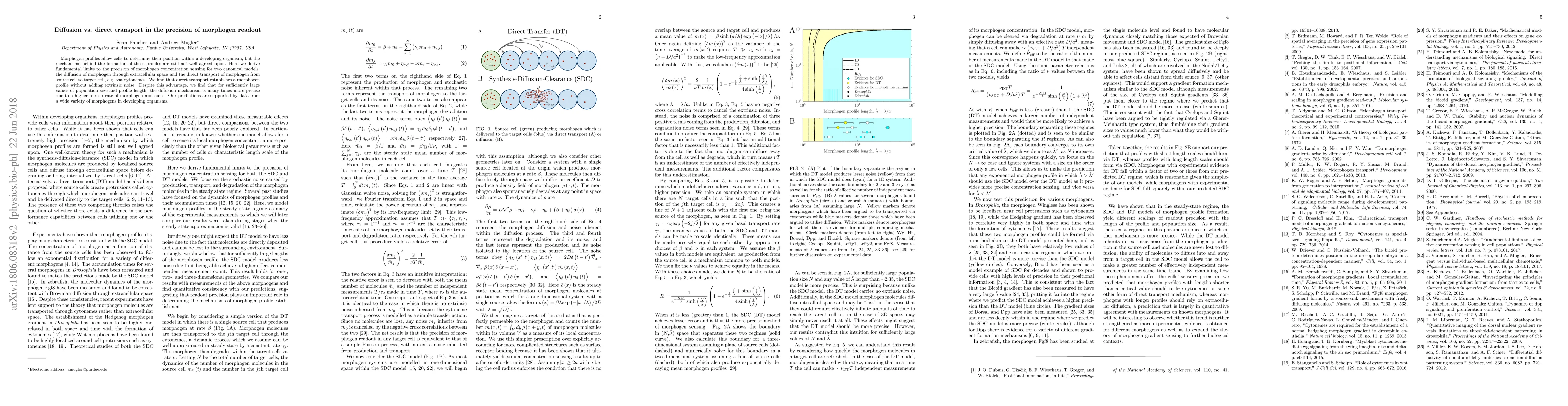This paper compares the precision of morphogen concentration sensing in two models: diffusion and direct transport. Direct transport offers better initial precision without extrinsic noise, but diffusion becomes significantly more precise at larger population sizes and profile lengths due to a higher refresh rate.