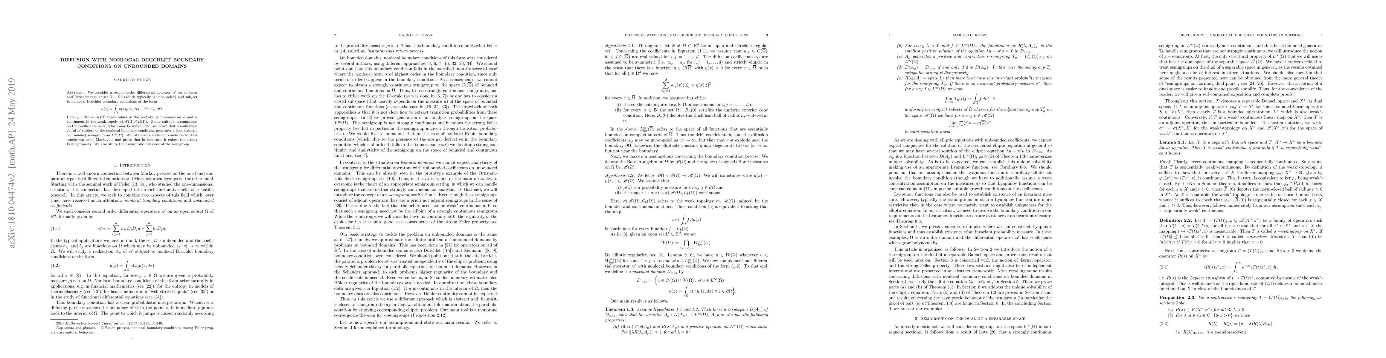 This paper investigates a second-order differential operator with nonlocal Dirichlet boundary conditions on unbounded domains, proving the generation of a semigroup on $L^\infty(\Omega)$ and establishing conditions for it to be Markovian and strong Feller. The study also examines the asymptotic behavior of the semigroup.