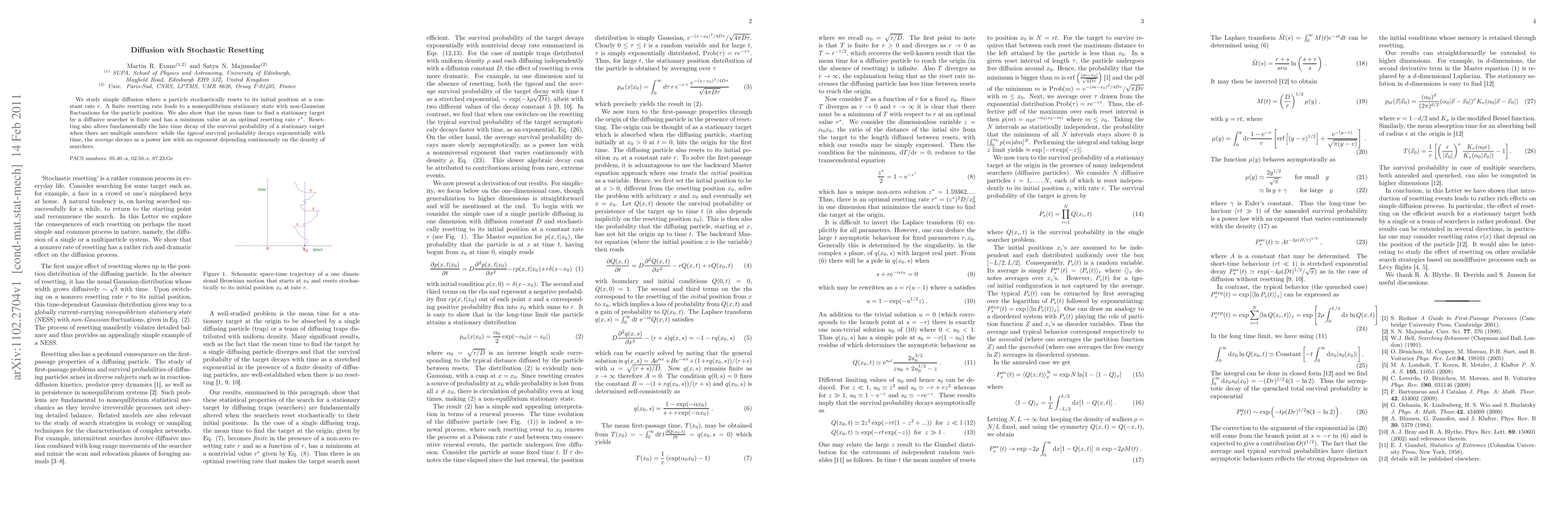 This paper investigates diffusion with stochastic resetting, revealing that a finite resetting rate creates a nonequilibrium stationary state with non-Gaussian fluctuations. It also finds that the mean time to locate a stationary target is finite and minimal at an optimal resetting rate, while the survival probability of multiple searchers decays exponentially on average but as a power law typically.