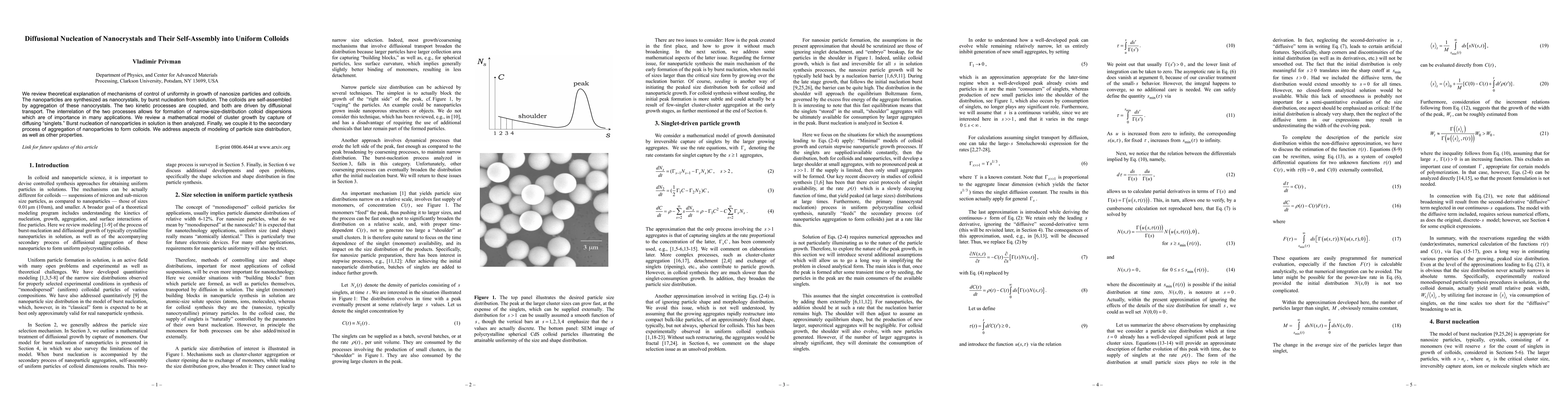 We review theoretical explanation of mechanisms of control of uniformity in growth of nanosize particles and colloids. The nanoparticles are synthesized as nanocrystals, by burst nucleation from solution. The colloids are self-assembled by aggregation of these nanocrystals. The two kinetic processes are coupled, and both are driven by diffusional transport. The interrelation of the two processes allows for formation of narrow-size-distribution colloid dispersions which are of importance in many applications. We review a mathematical model of cluster growth by capture of diffusing "singlets." Burst nucleation of nanoparticles in solution is then analyzed. Finally, we couple it to the secondary process of aggregation of nanoparticles to form colloids. We address aspects of modeling of particle size distribution, as well as other properties.